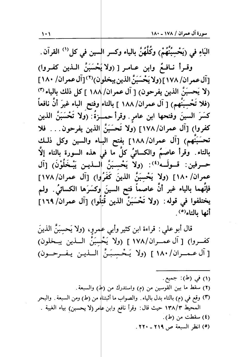(3) وقع في (م) بالتاء بدل بالياء. والصواب ما أثبتناه من (ط) ومن السبعة. والبحر المحيط 3/ 138 حيث قال: وقرأ نافع وابن عامر (لا يحسبن) بياء الغيبة.