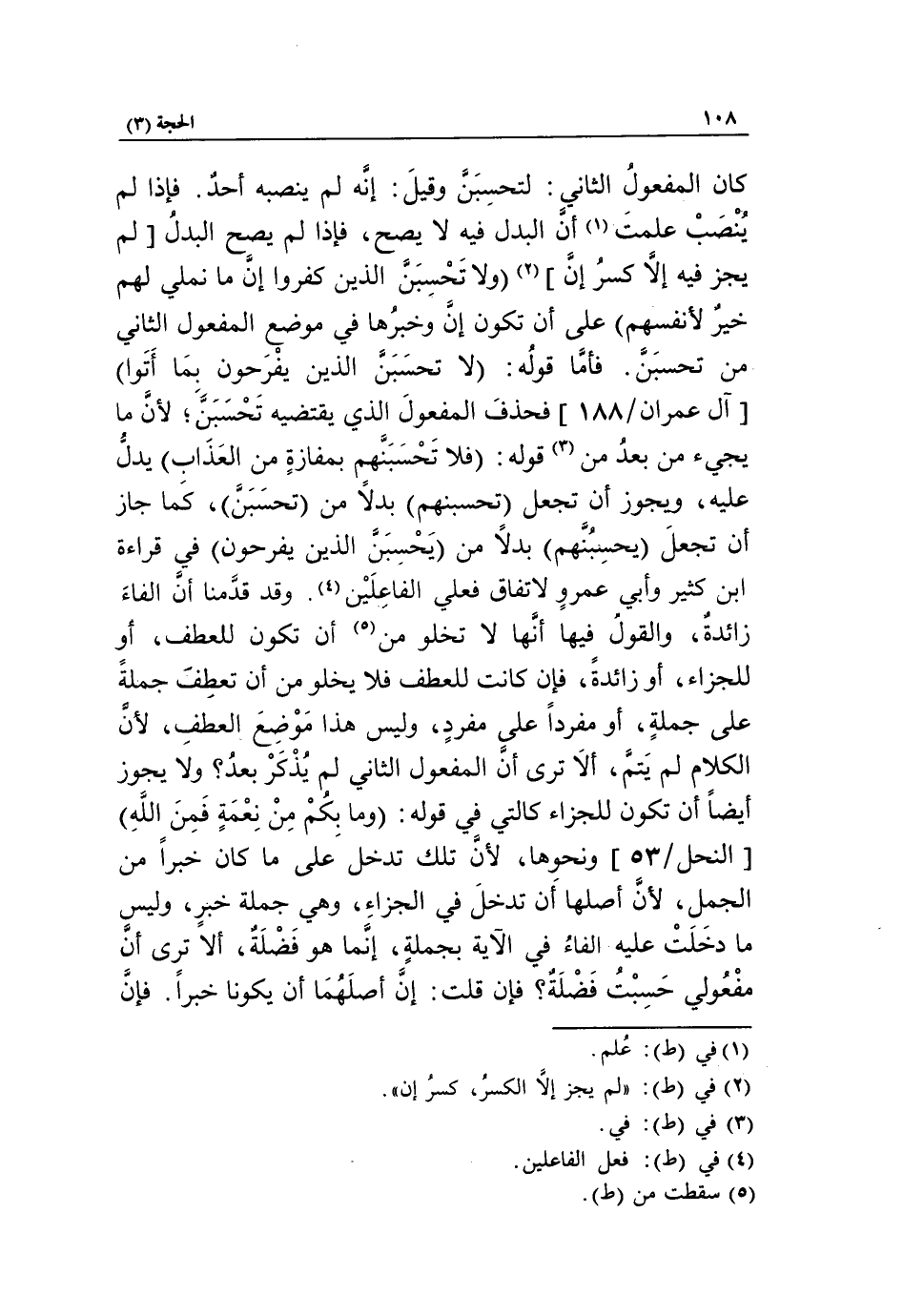 كان المفعول الثاني: لتحسبنّ وقيل: إنّه لم ينصبه أحد. فإذا لم ينصب علمت «1» أنّ البدل فيه لا يصح، فإذا لم يصح البدل [لم يجز فيه إلّا كسر إنّ] «2» ولا تحسبن الذين كفروا إن ما نملي لهم خير لأنفسهم على أن تكون إنّ وخبرها في موضع المفعول الثاني من تحسبنّ. فأمّا قوله: لا تحسبن الذين يفرحون بما أتوا [آل عمران/ 188] فحذف المفعول الذي يقتضيه تحسبنّ، لأنّ ما يجيء من بعد من «3» قوله: فلا تحسبنهم بمفازة من العذاب يدلّ عليه، ويجوز أن تجعل تحسبنهم بدلا من تحسبن، كما جاز أن تجعل يحسبنهم بدلا من يحسبن الذين يفرحون في قراءة ابن كثير وأبي عمرو لاتفاق فعلي الفاعلين «4». وقد قدّمنا أنّ الفاء زائدة، والقول فيها أنّها لا تخلو من «5» أن تكون للعطف، أو للجزاء، أو زائدة، فإن كانت للعطف فلا يخلو من أن تعطف جملة على جملة، أو مفردا على مفرد، وليس هذا موضع العطف، لأنّ الكلام لم يتمّ، ألا ترى أنّ المفعول الثاني لم يذكر بعد؟ ولا يجوز أيضا أن تكون للجزاء كالتي في قوله: وما بكم من نعمة فمن الله [النحل/ 53] ونحوها، لأنّ تلك تدخل على ما كان خبرا من الجمل، لأنّ أصلها أن تدخل في الجزاء، وهي جملة خبر، وليس ما دخلت عليه الفاء في الآية بجملة، إنّما هو فضلة، ألا ترى أنّ مفعولي حسبت فضلة؟ فإن قلت: إنّ أصلهما أن يكونا خبرا، فإنّ