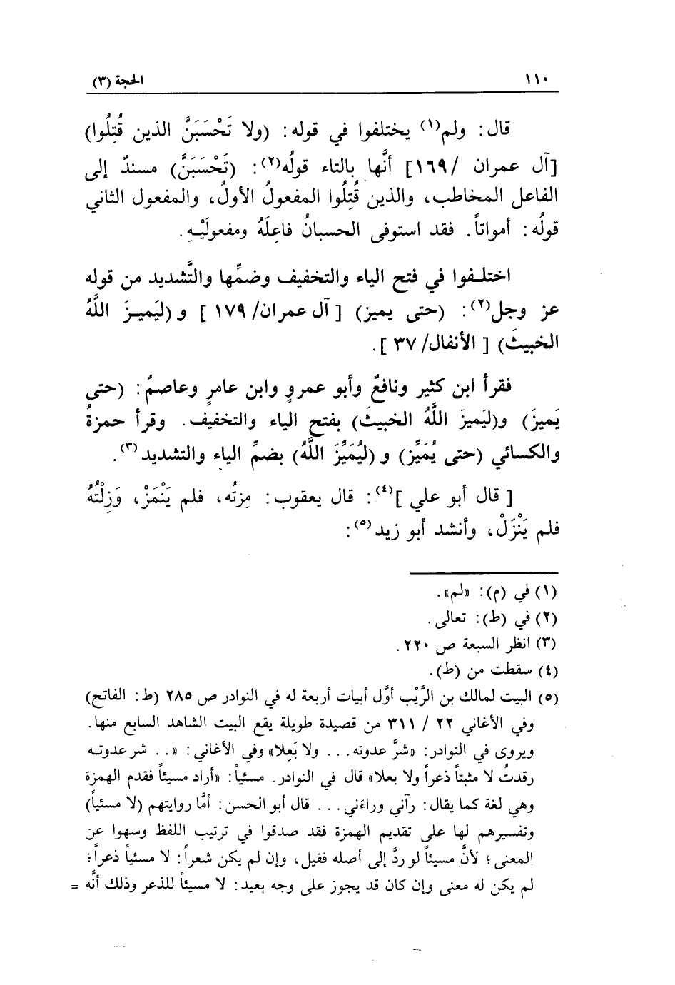 قال: ولم «1» يختلفوا في قوله: ولا تحسبن الذين قتلوا [آل عمران/ 169] أنّها بالتاء قوله «2»: تحسبن مسند إلى الفاعل المخاطب، والذين قتلوا المفعول الأول، والمفعول الثاني قوله: أمواتا. فقد استوفى الحسبان فاعله ومفعوليه.