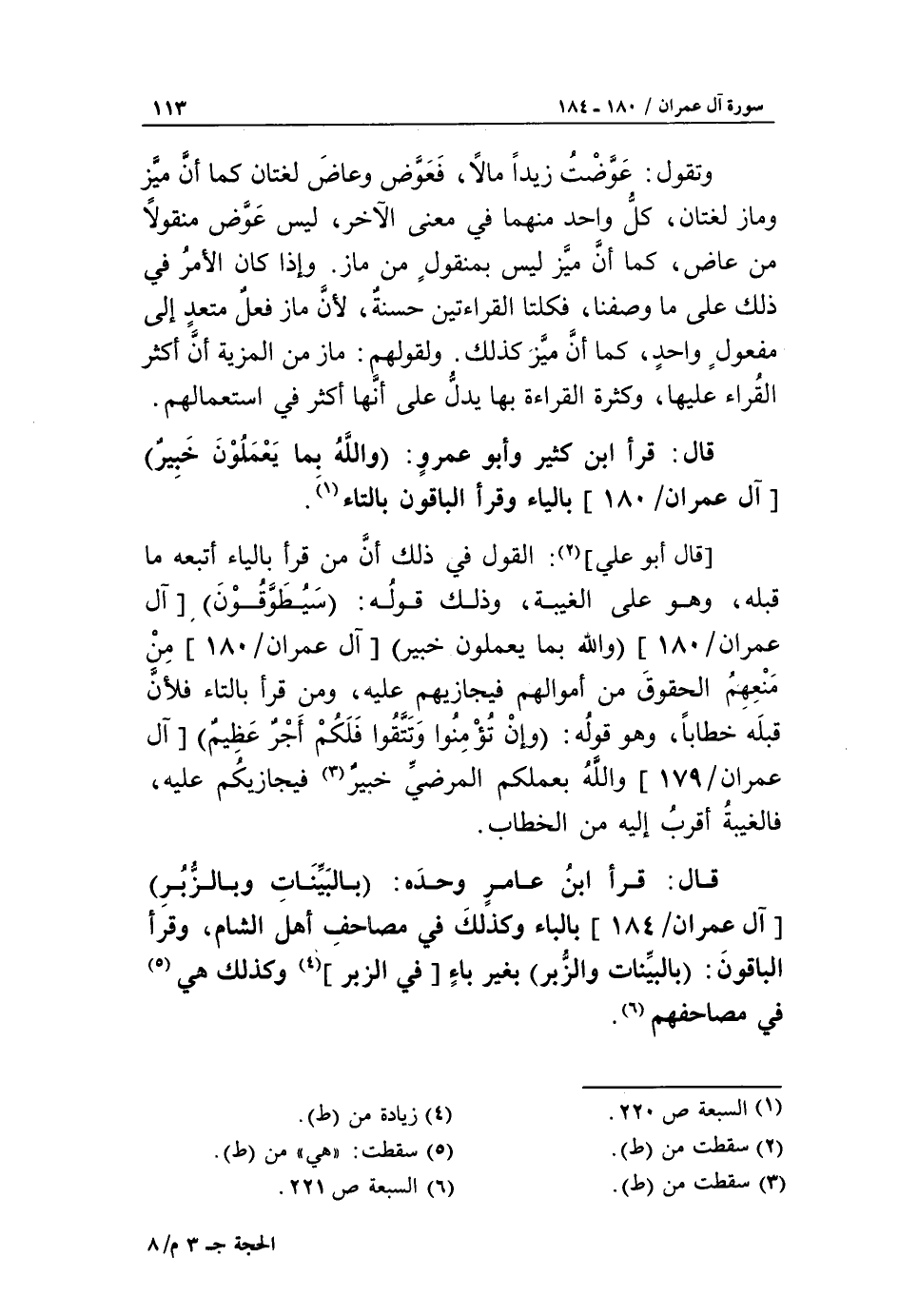 قال: قرأ ابن كثير وأبو عمرو: والله بما يعملون خبير [آل عمران/ 180] بالياء وقرأ الباقون بالتاء «1».
