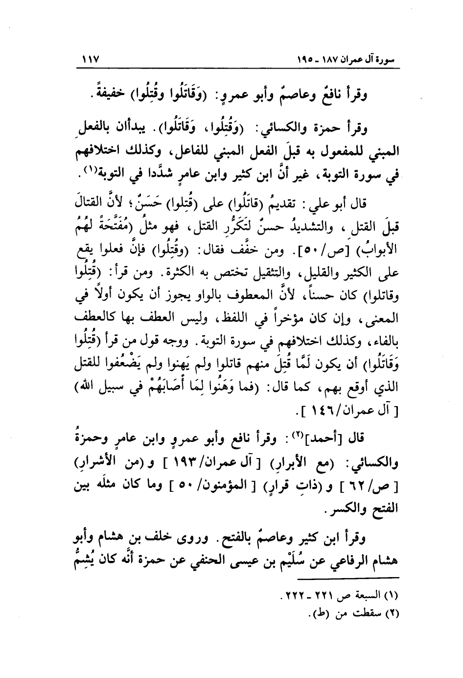وقرأ حمزة والكسائي: وقتلوا، وقاتلوا. يبدءان بالفعل المبني للمفعول به قبل الفعل المبني للفاعل، وكذلك اختلافهم في سورة التوبة، غير أنّ ابن كثير وابن عامر شدّدا في التوبة «1».