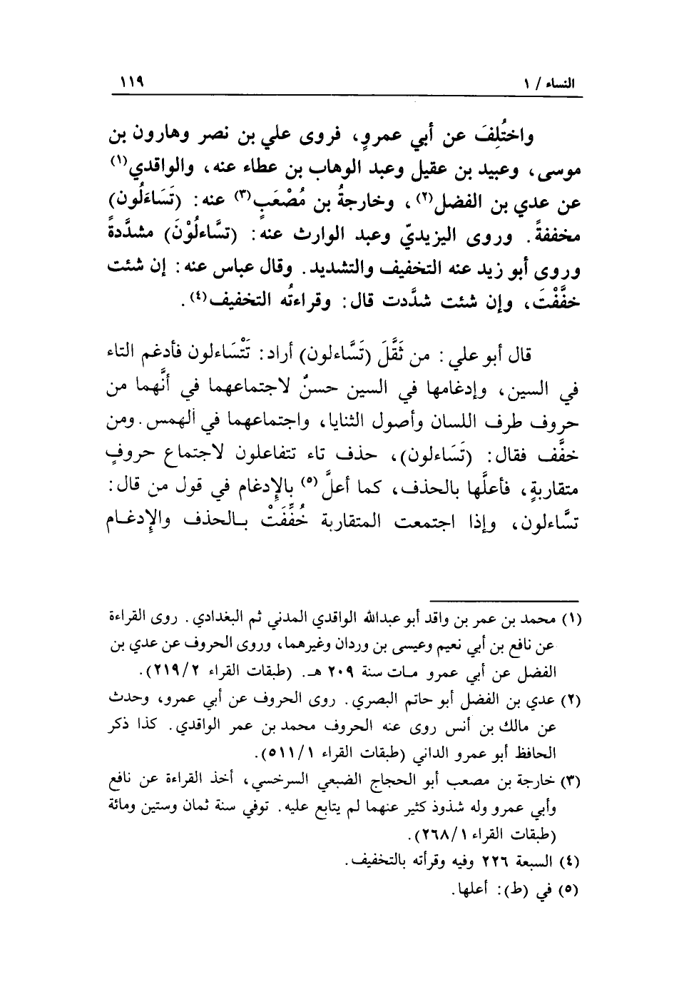 (1) محمد بن عمرو بن واقد أبو عبد الله الواقدي المدني ثم البغدادي. روى القراءة عن نافع بن أبي نعيم وعيسى بن وردان وغيرهما، وروى الحروف عن عدي بن الفضل عن أبي عمرو مات سنة 209 هـ. (طبقات القراء 2/ 219).