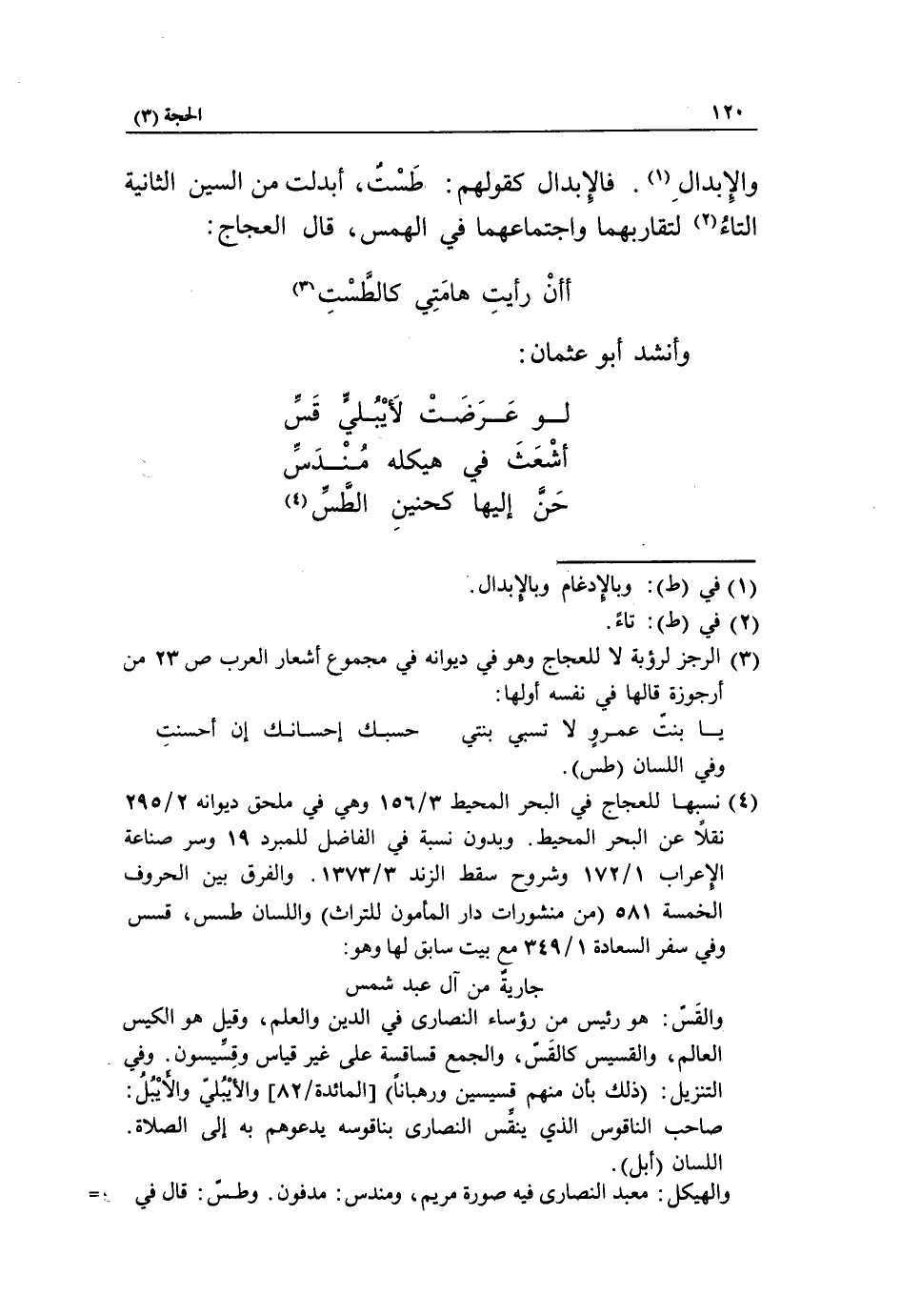 (4) نسبها للعجاج في البحر المحيط 3/ 156 وهي في ملحق ديوانه 2/ 295 نقلا عن البحر المحيط. وبدون نسبة في الفاضل للمبرد 19 وسر صناعة الإعراب 1/ 172 وشروح سقط الزند 3/ 1373. والفرق بين الحروف الخمسة 581 (من منشورات دار المأمون للتراث) واللسان طسس، قسس وفي سفر السعادة 1/ 349 مع بيت سابق لها وهو: