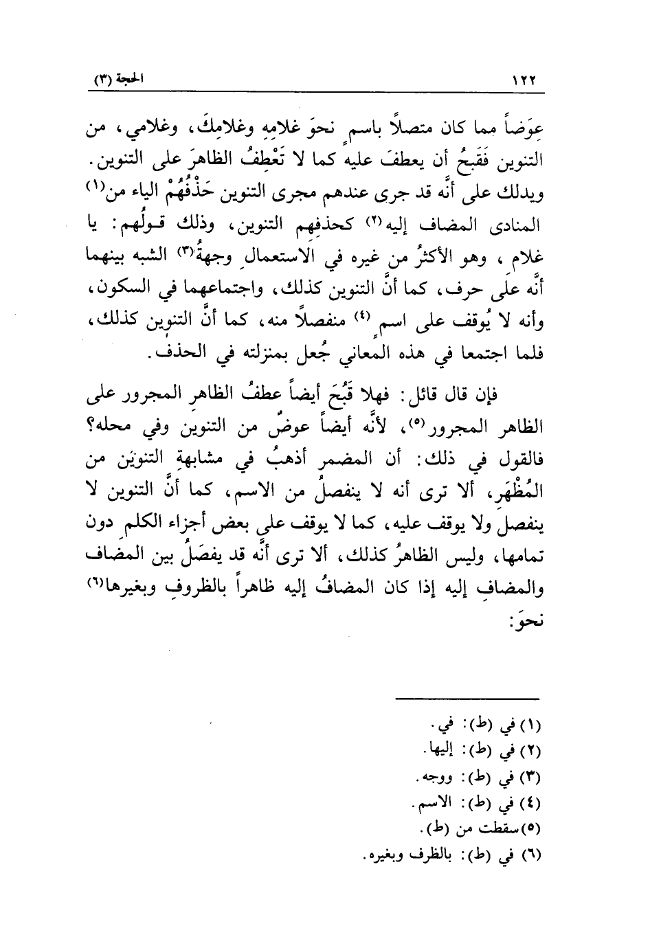 فإن قال قائل: فهلا قبح أيضا عطف الظاهر المجرور على الظاهر المجرور «5»، لأنّه أيضا عوض من التنوين وفي محله؟