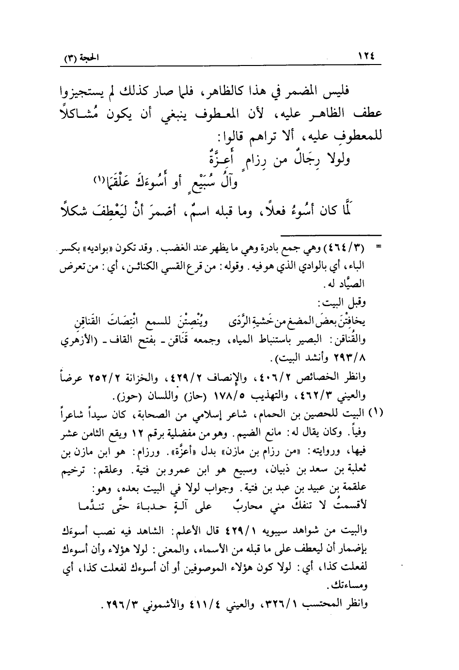 (1) البيت للحصين بن الحمام، شاعر إسلامي من الصحابة، كان سيدا شاعرا وفيا. وكان يقال له: مانع الضيم. وهو من مفضلية برقم 12 ويقع الثامن عشر فيها، وروايته: «من رزام بن مازن» بدل «أعزّة». ورزام: هو ابن مازن بن ثعلبة بن سعد بن ذبيان، وسبيع هو ابن عمرو بن فتية. وعلقم: ترخيم علقمة بن عبيد بن عبد بن فتية. وجواب لولا في البيت بعده، وهو: