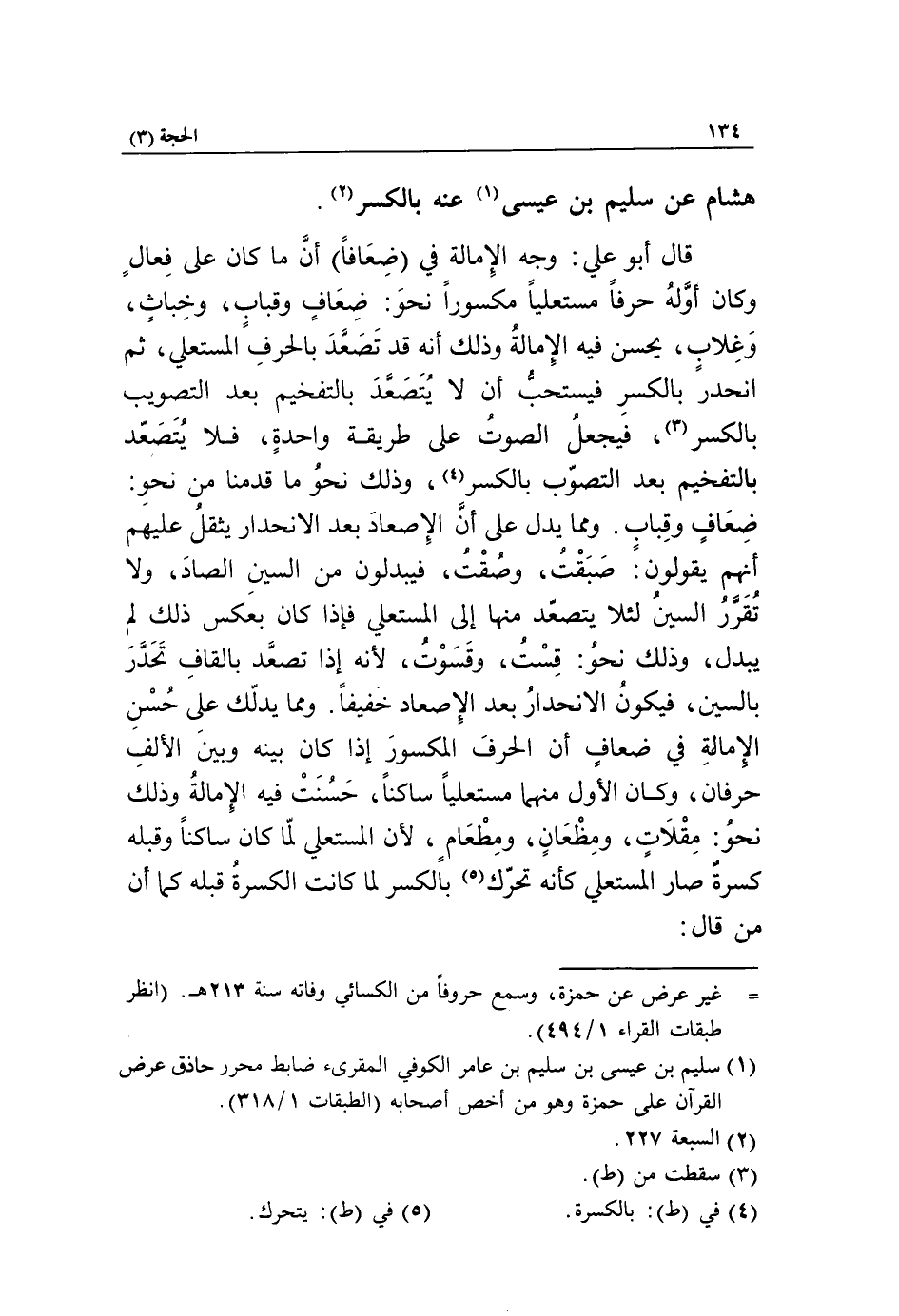 ضعاف وقباب. ومما يدل على أنّ الإصعاد بعد الانحدار يثقل عليهم أنهم يقولون: صبقت، وصقت، فيبدلون من السين الصاد، ولا تقرّر السين لئلا يتصعّد منها إلى المستعلي فإذا كان بعكس ذلك لم يبدل، وذلك نحو: قست، وقسوت، لأنه إذا تصعّد بالقاف تحدّر بالسين، فيكون الانحدار بعد الإصعاد خفيفا. ومما يدلّك على حسن الإمالة في ضعاف أن الحرف المكسور إذا كان بينه وبين الألف حرفان، وكان الأول منهما مستعليا ساكنا، حسنت فيه الإمالة وذلك نحو: مقلات، ومظعان، ومطعام، لأن المستعلي لمّا كان ساكنا وقبله كسرة صار المستعلي كأنه تحرّك «5» بالكسر لما كانت الكسرة قبله كما أن من قال: