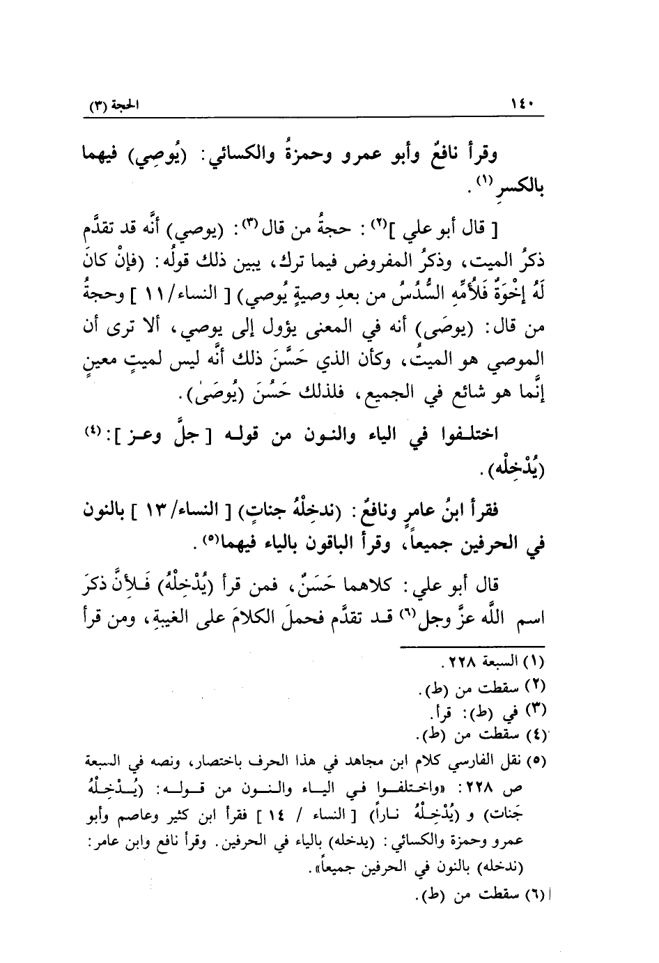 (5) نقل الفارسي كلام ابن مجاهد في هذا الحرف باختصار، ونصه في السبعة ص 228: «واختلفوا في الياء والنون من قوله: يدخله جنات ويدخله نارا [النساء/ 14] فقرأ ابن كثير وعاصم وأبو عمرو وحمزة والكسائي: (يدخله) بالياء في الحرفين. وقرأ نافع وابن عامر: