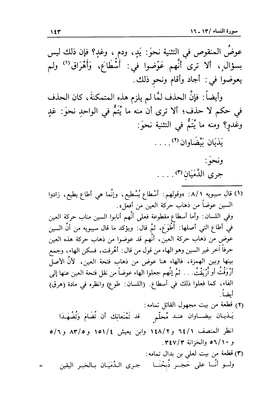 عوض المنقوص في التثنية نحو: يد، ودم، وغد؟ فإن ذلك ليس بسؤال، ألا ترى أنّهم عوّضوا في: أسطاع، وأهراق «1» ولم يعوضوا في: أجاد وأقام ونحو ذلك.