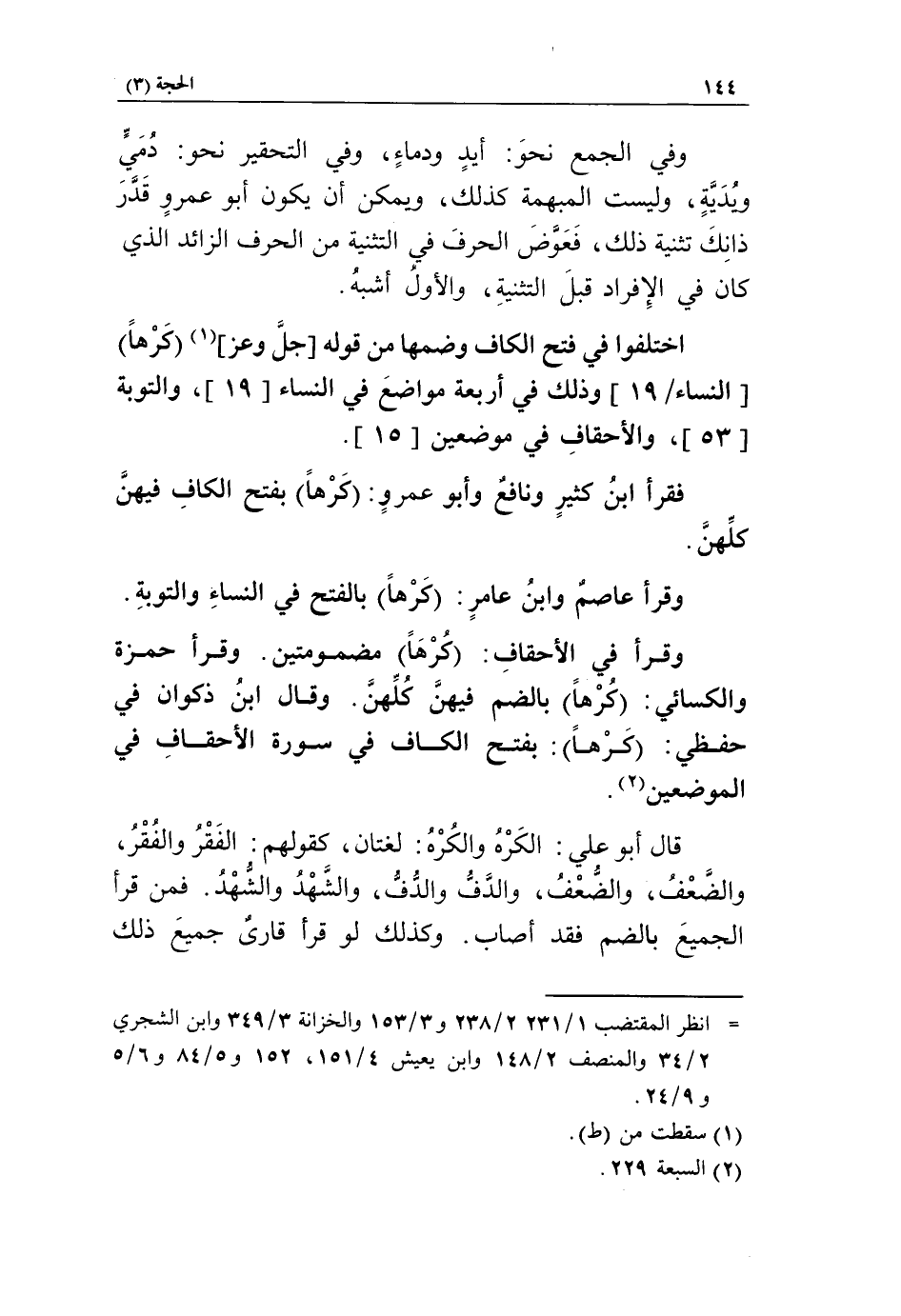 وقرأ في الأحقاف: كرها* مضمومتين. وقرأ حمزة والكسائي: كرها* بالضم فيهنّ كلّهنّ. وقال ابن ذكوان في حفظي: كرها: بفتح الكاف في سورة الأحقاف في الموضعين
