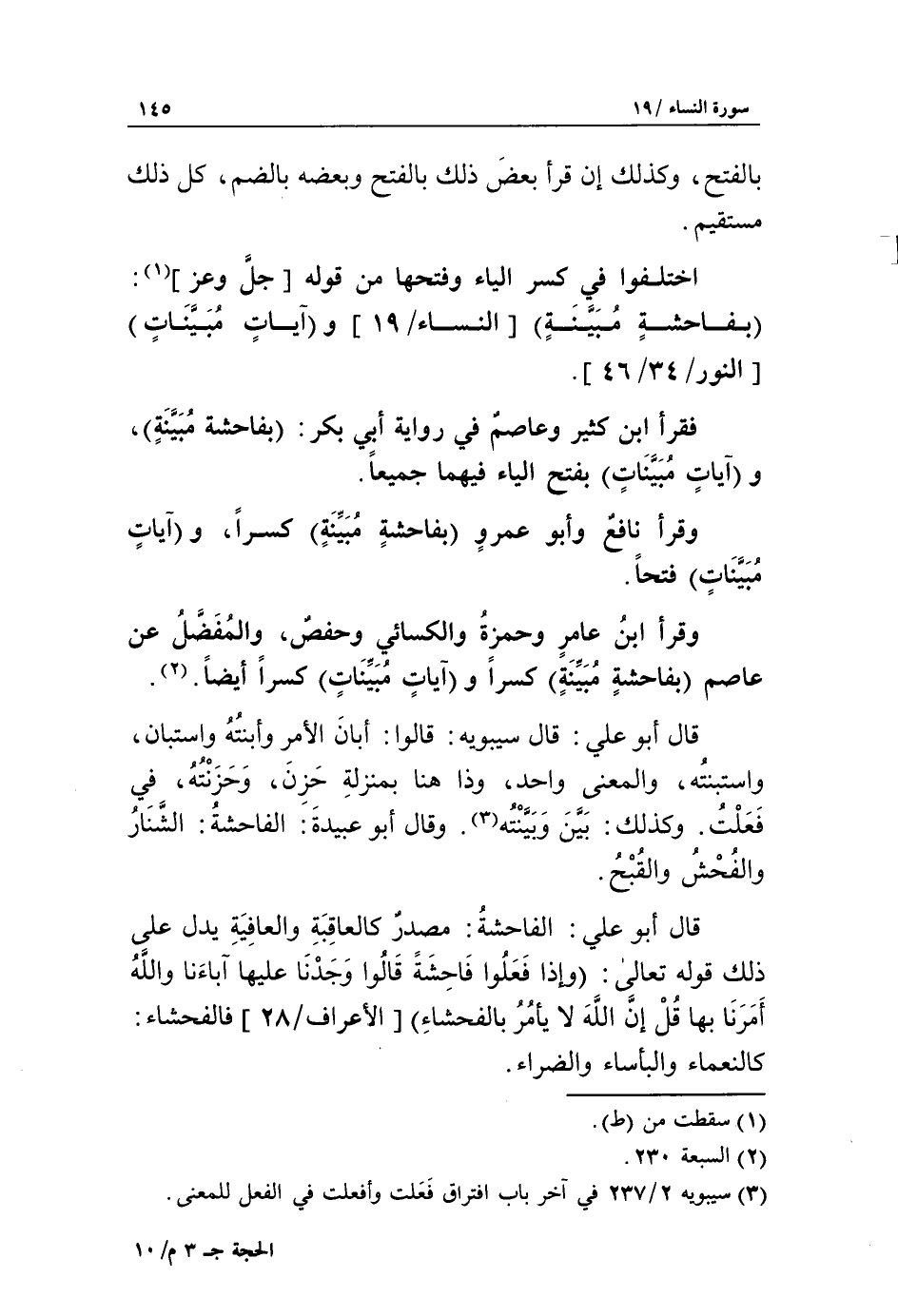 وقرأ ابن عامر وحمزة والكسائي وحفص، والمفضّل عن عاصم بفاحشة مبينة كسرا وآيات مبينات كسرا أيضا «2».