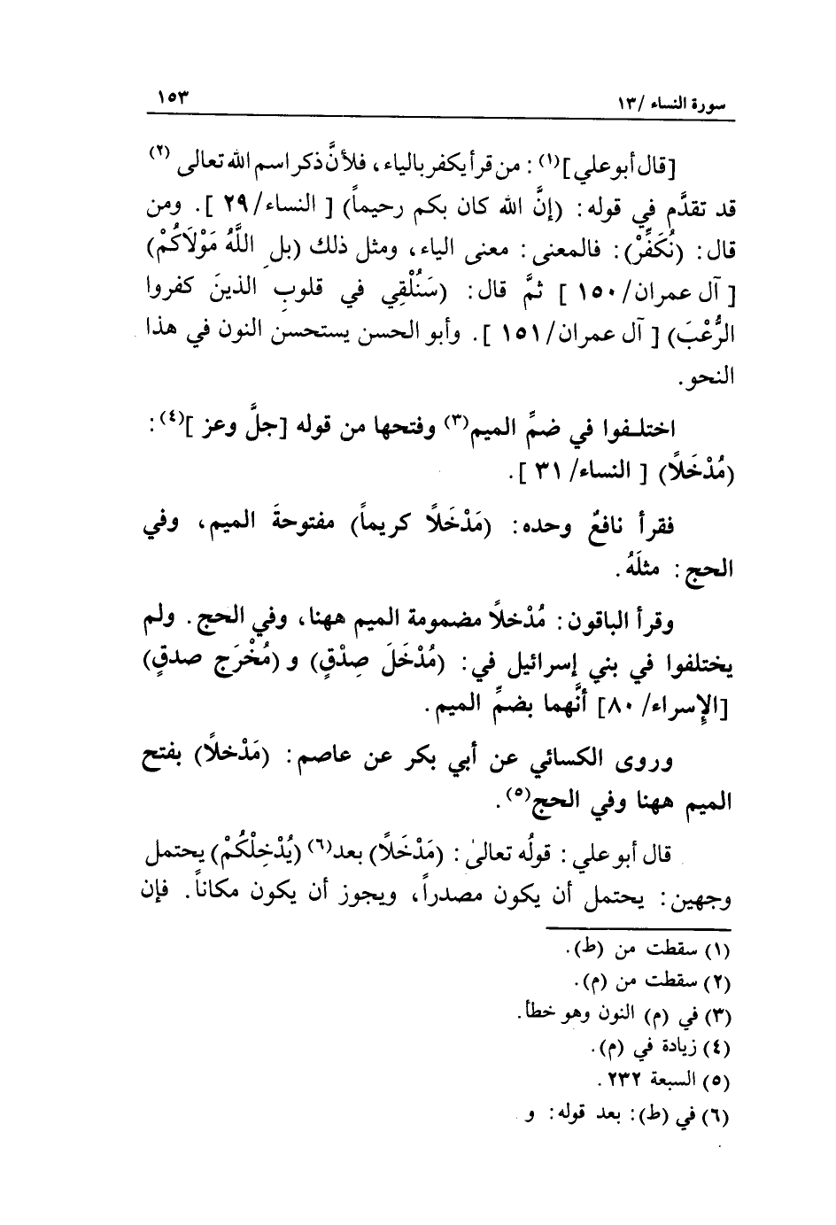 قال أبو علي: قوله تعالى: مدخلا* بعد «6» يدخلكم* يحتمل وجهين: يحتمل أن يكون مصدرا، ويجوز أن يكون مكانا. فإن