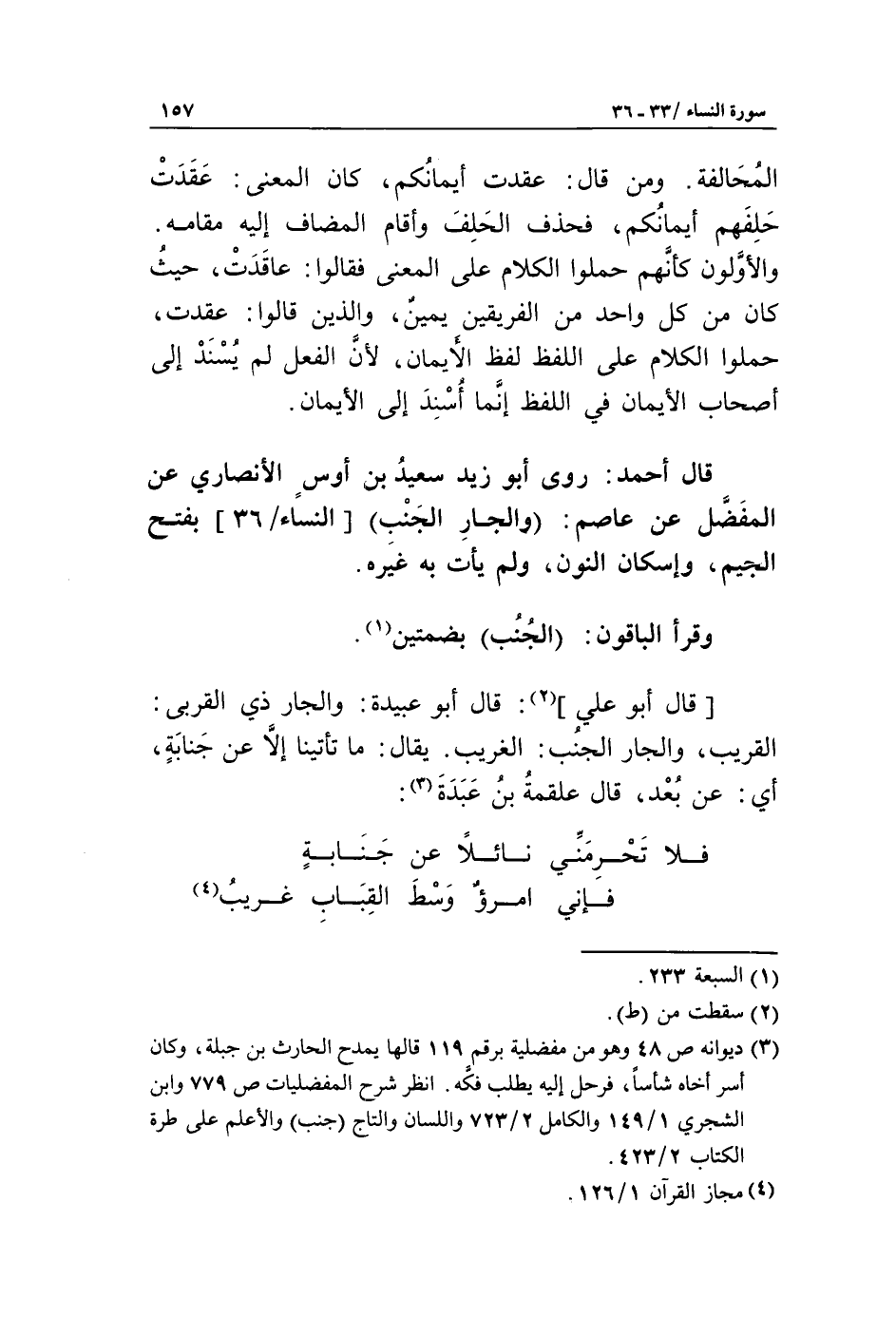 قال أحمد: روى أبو زيد سعيد بن أوس الأنصاري عن المفضّل عن عاصم: والجار الجنب [النساء/ 36] بفتح الجيم، وإسكان النون، ولم يأت به غيره.