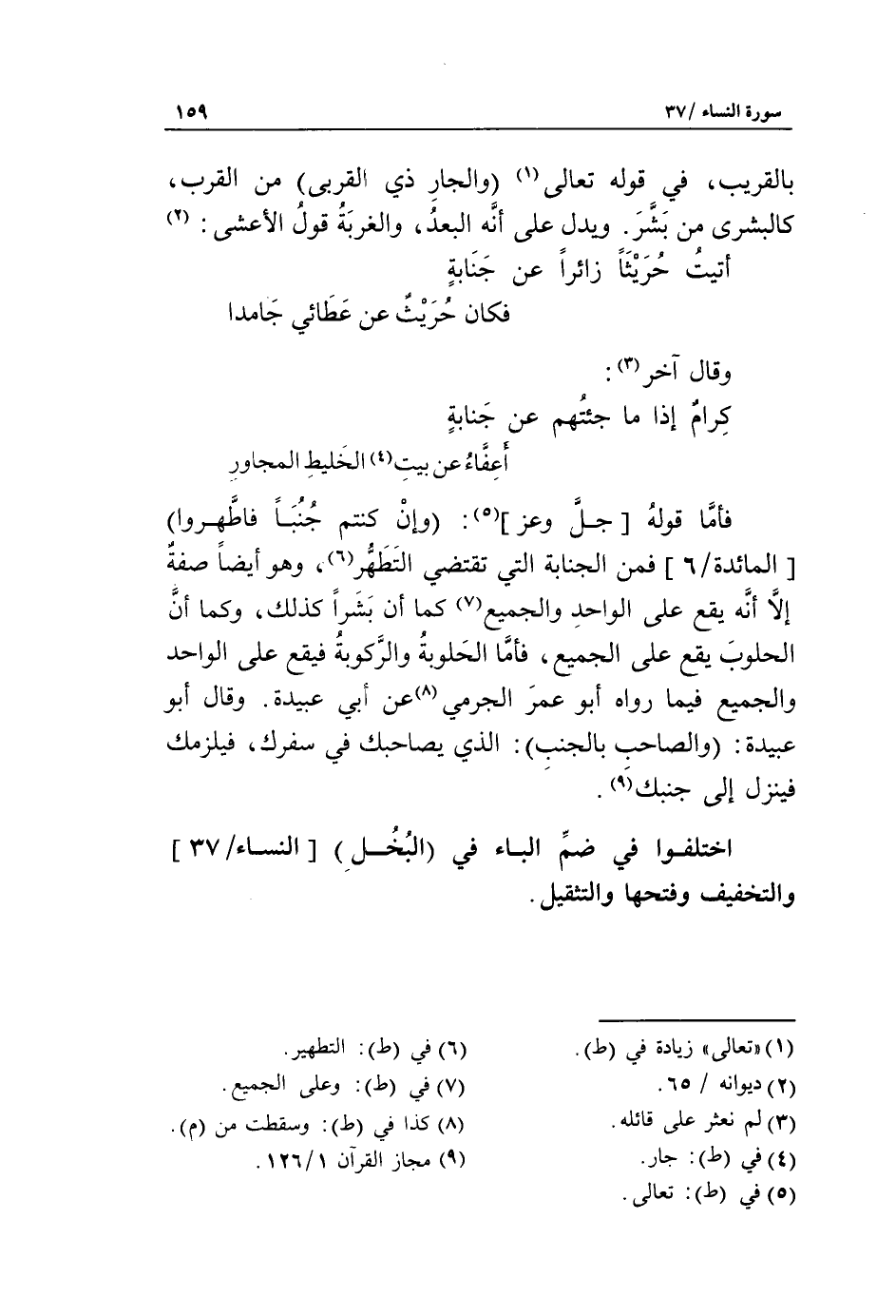 فأمّا قوله [جلّ وعز] «5»: وإن كنتم جنبا فاطهروا [المائدة/ 6] فمن الجنابة التي تقتضي التطهّر «6»، وهو أيضا صفة إلّا أنّه يقع على الواحد والجميع «7» كما أن بشرا كذلك، وكما أنّ الحلوب يقع على الجميع، فأمّا الحلوبة والرّكوبة فيقع على الواحد والجميع فيما رواه أبو عمر الجرمي «8» عن أبي عبيدة. وقال أبو عبيدة: والصاحب بالجنب: الذي يصاحبك في سفرك، فيلزمك فينزل إلى جنبك «9».