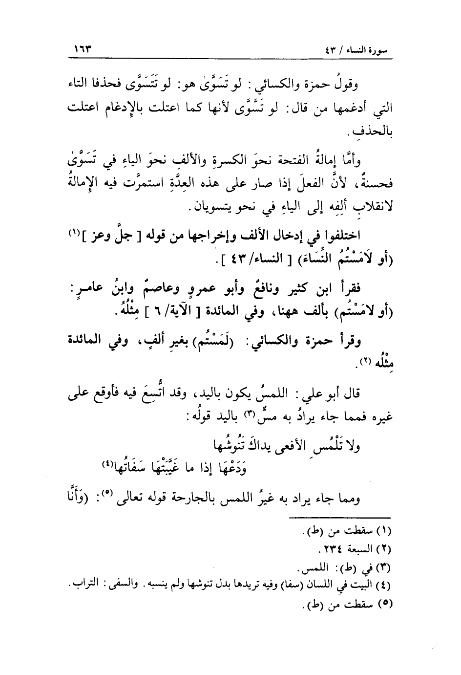 اختلفوا في إدخال الألف وإخراجها من قوله [جلّ وعز] «1» أو لامستم النساء [النساء/ 43].