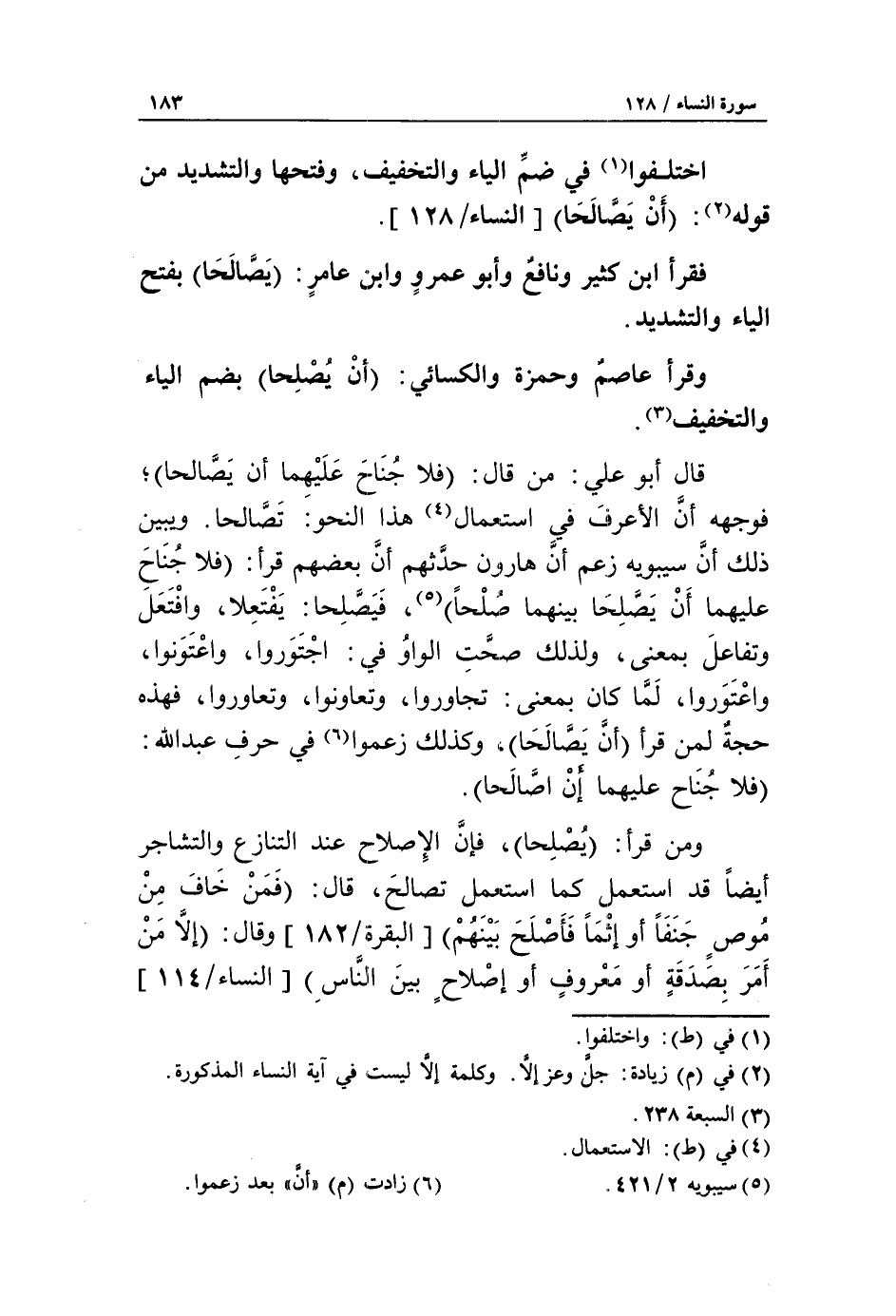 ومن قرأ: يصلحا، فإنّ الإصلاح عند التنازع والتشاجر أيضا قد استعمل كما استعمل تصالح، قال: فمن خاف من موص جنفا أو إثما فأصلح بينهم [البقرة/ 182] وقال: إلا من أمر بصدقة أو معروف أو إصلاح بين الناس [النساء/ 114]