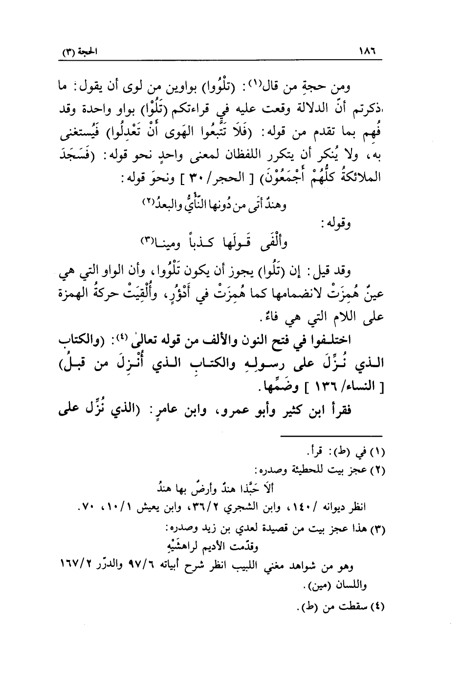 ومن حجة من قال «1»: تلووا بواوين من لوى أن يقول: ما ذكرتم أنّ الدلالة وقعت عليه في قراءتكم تلوا بواو واحدة وقد فهم بما تقدم من قوله: فلا تتبعوا الهوى أن تعدلوا فيستغنى به، ولا ينكر أن يتكرر اللفظان لمعنى واحد نحو قوله: فسجد الملائكة كلهم أجمعون [الحجر/ 30] ونحو قوله: