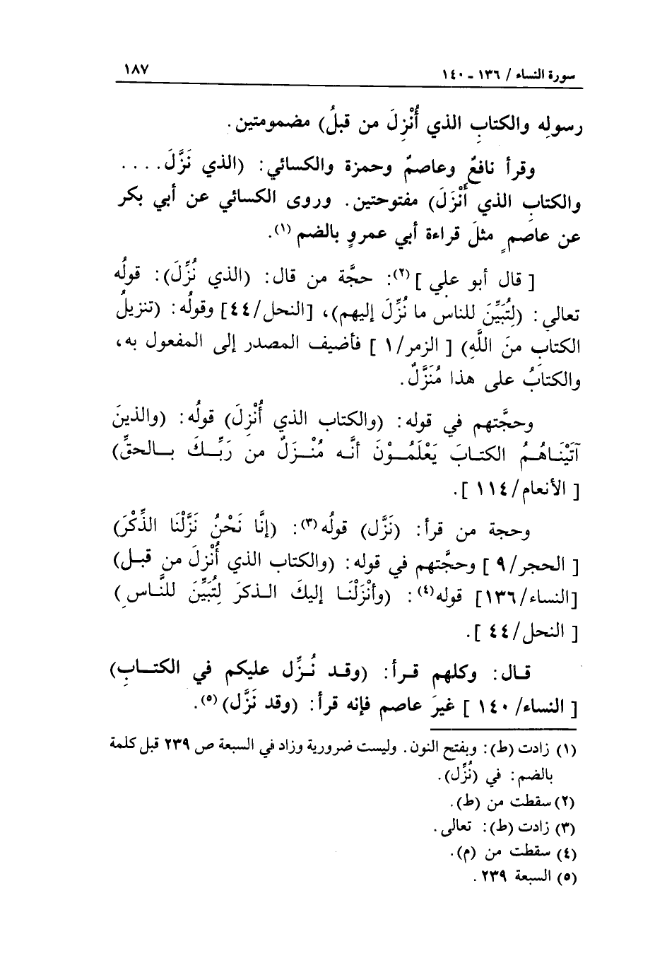 (1) زادت (ط): وبفتح النون. وليست ضرورية وزاد في السبعة ص 239 قبل كلمة بالضم: في (نزّل).