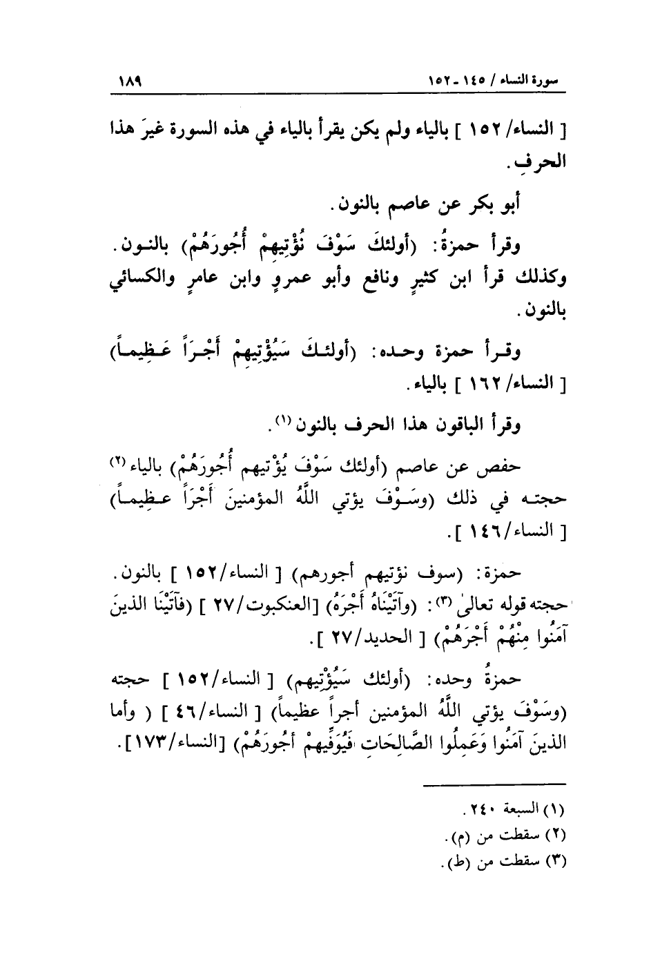 حمزة وحده: أولئك سيؤتيهم [النساء/ 152] حجته وسوف يؤتي الله المؤمنين أجرا عظيما [النساء/ 146] وأما الذين آمنوا وعملوا الصالحات فيوفيهم أجورهم [النساء/ 173].