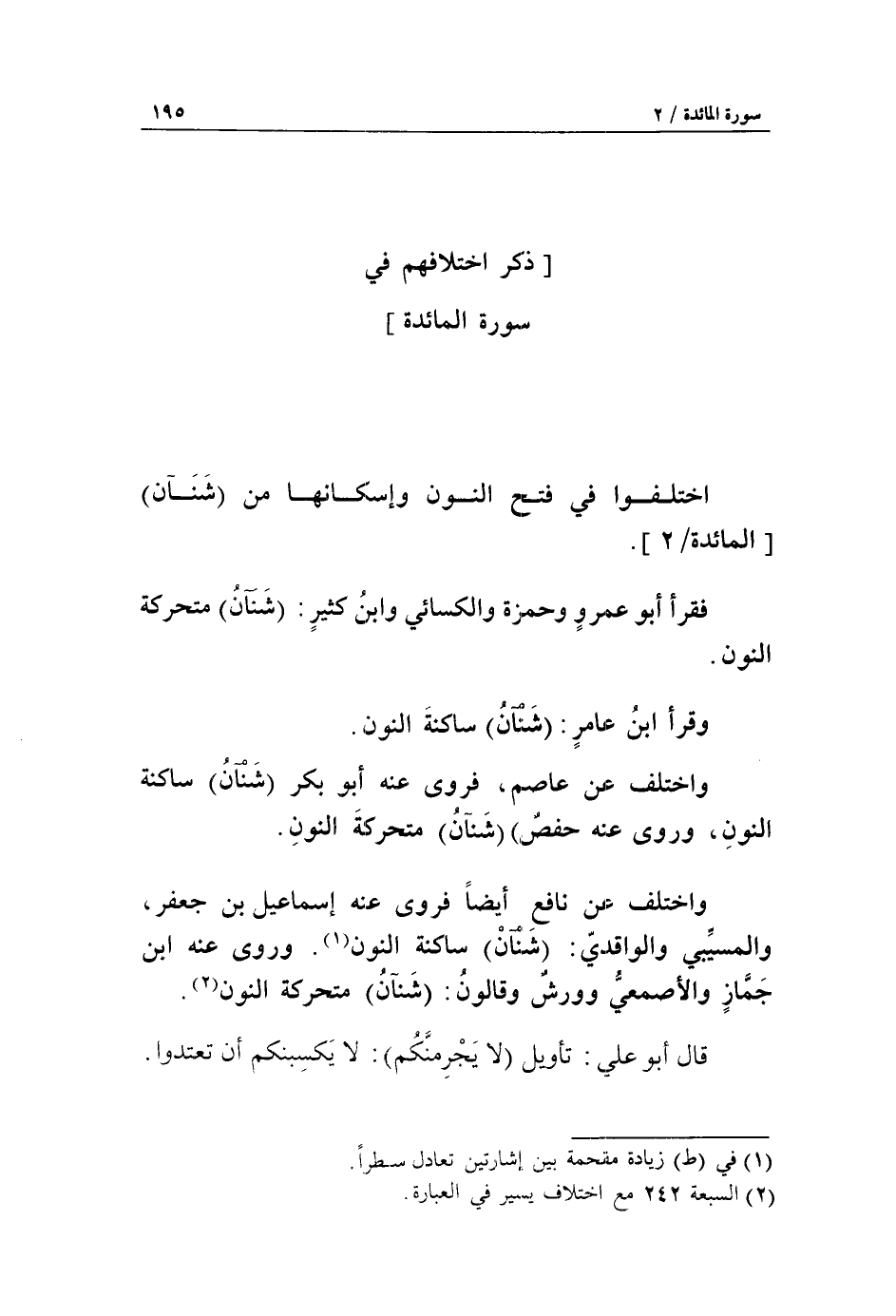 اختلفوا في فتح النون وإسكانها من شنآن [المائدة/ 2].