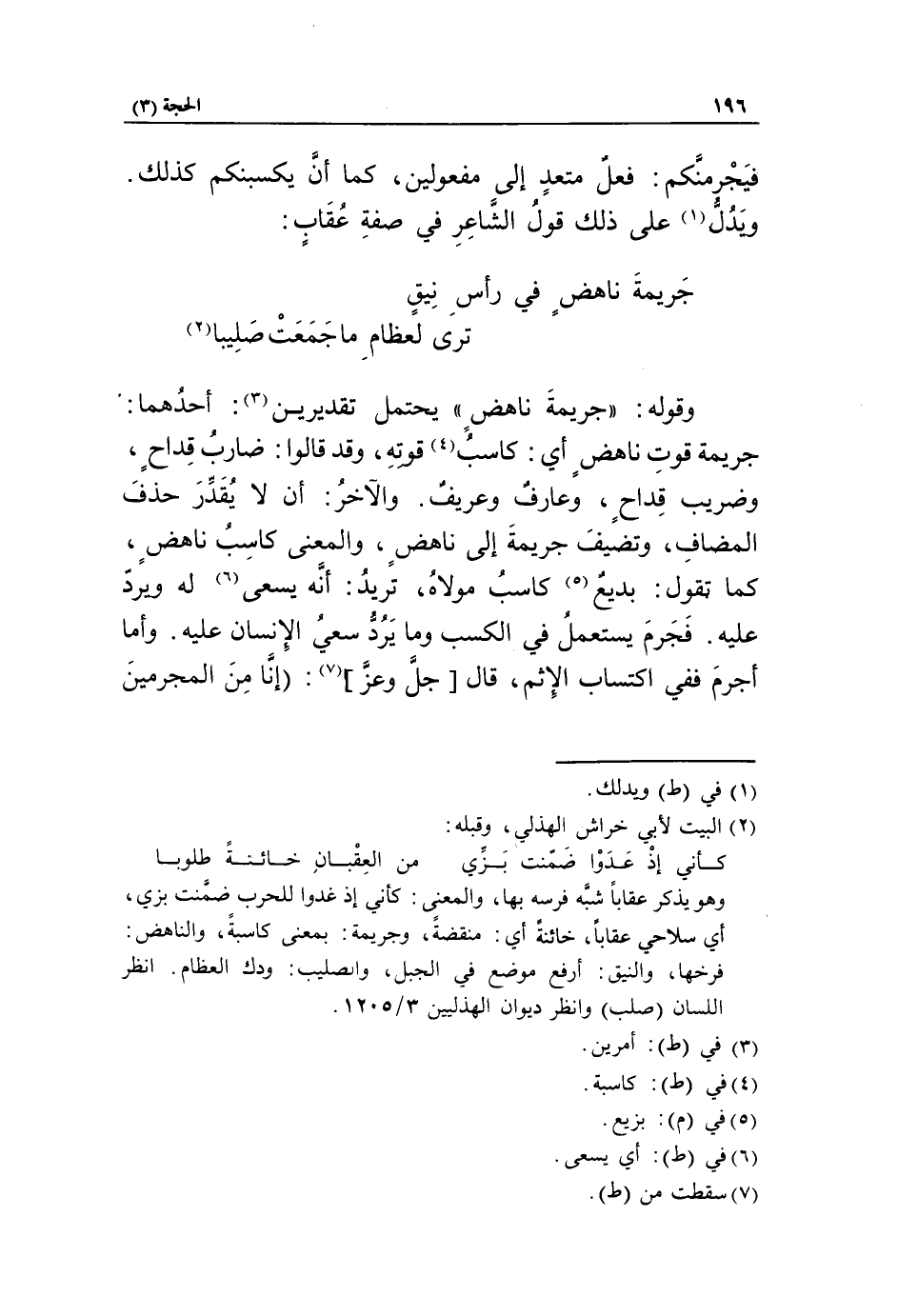جريمة قوت ناهض أي: كاسب «4» قوته، وقد قالوا: ضارب قداح، وضريب قداح، وعارف وعريف. والآخر: أن لا يقدّر حذف المضاف، وتضيف جريمة إلى ناهض، والمعنى كاسب ناهض، كما تقول: بديع «5» كاسب مولاه، تريد: أنّه يسعى «6» له ويردّ عليه. فجرم يستعمل في الكسب وما يردّ سعي الإنسان عليه. وأما أجرم ففي اكتساب الإثم، قال [جلّ وعزّ] «7»: إنا من المجرمين منتقمون [السجدة/ 22].