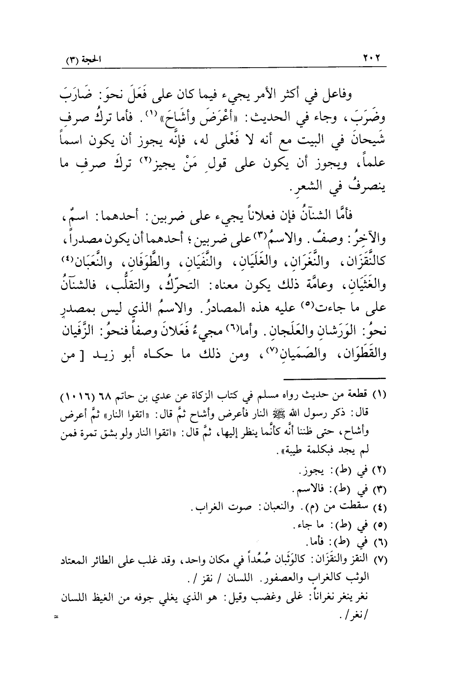 فأمّا الشنان فإن فعلانا يجيء على ضربين: أحدهما: اسم، والآخر: وصف. والاسم «3» على ضربين؛ أحدهما أن يكون مصدرا، كالنّقزان، والنّغران، والغليان، والنّفيان، والطّوفان، والنّعبان «4» والغثيان، وعامّة ذلك يكون معناه: التحرّك، والتقلّب، فالشنان على ما جاءت «5» عليه هذه المصادر. والاسم الذي ليس بمصدر نحو: الورشان والعلجان. وأما «6» مجيء فعلان وصفا فنحو: الزّفيان والقطوان، والصميان «7»، ومن ذلك ما حكاه أبو زيد [من