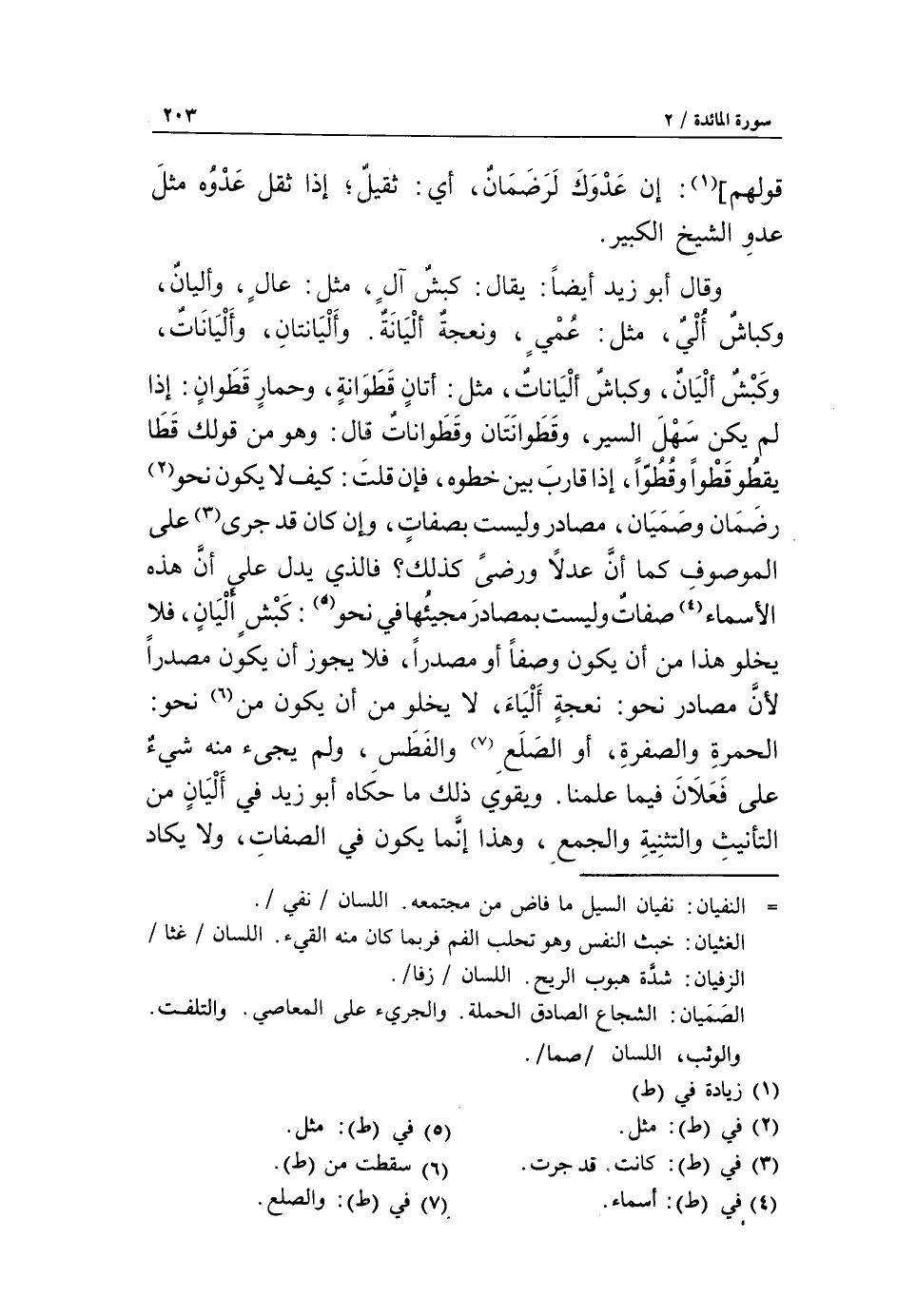وقال أبو زيد أيضا: يقال: كبش آل، مثل: عال، وأليان، وكباش ألي، مثل: عمي، ونعجة أليانة. وأليانتان، وأليانات، وكبش أليان، وكباش أليانات، مثل: أتان قطوانة، وحمار قطوان: إذا لم يكن سهل السير، وقطوانتان وقطوانات قال: وهو من قولك قطا يقطو قطوا وقطوّا، إذا قارب بين خطوه، فإن قلت: كيف لا يكون نحو «2» رضمان وصميان، مصادر وليست بصفات، وإن كان قد جرى «3» على الموصوف كما أنّ عدلا ورضى كذلك؟ فالذي يدل على أنّ هذه الأسماء «4» صفات وليست بمصادر مجيئها في نحو «5»: كبش أليان، فلا يخلو هذا من أن يكون وصفا أو مصدرا، فلا يجوز أن يكون مصدرا لأنّ مصادر نحو: نعجة ألياء، لا يخلو من أن يكون من «6» نحو: