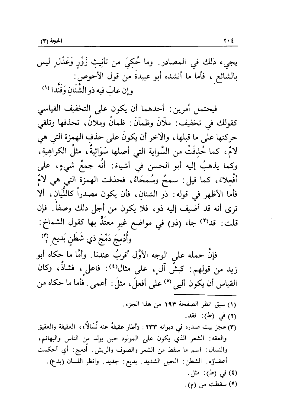 وإن عاب فيه ذو الشّنان وفنّدا «1» فيحتمل أمرين: أحدهما أن يكون على التخفيف القياسي كقولك في تخفيف: ملآن وظمئان: ظمان وملآن، تحذفها وتلقي حركتها على ما قبلها، والآخر أن يكون على حذف الهمزة التي هي لام، كما حذفت من السّواية التي أصلها سوائية، مثل الكراهية، وكما يذهب إليه أبو الحسن في أشياء: أنّه جمع شيء، على أفعلاء، كما قيل: سمح وسمحاء، فحذفت الهمزة التي هي لام فأما الأظهر في قوله: ذو الشنان، فأن يكون مصدرا كاللّيان، ألا ترى أنه قد أضيف إليه ذو، فلا يكون من أجل ذلك وصفا. فإن قلت: قد «2» جاء (ذو) في مواضع غير معتدّ بها كقول الشماخ: