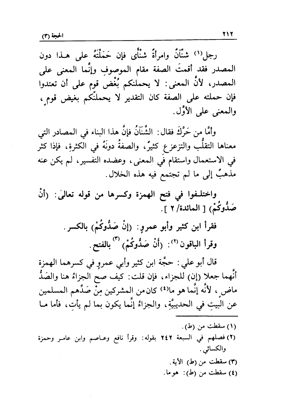 رجل «1» شنان وامرأة شنأى فإن حملته على هذا دون المصدر فقد أقمت الصفة مقام الموصوف وإنّما المعنى على المصدر، لأنّ المعنى: لا يحملنكم بغض قوم على أن تعتدوا فإن حملته على الصفة كان التقدير لا يحملنّكم بغيض قوم، والمعنى على الأوّل.