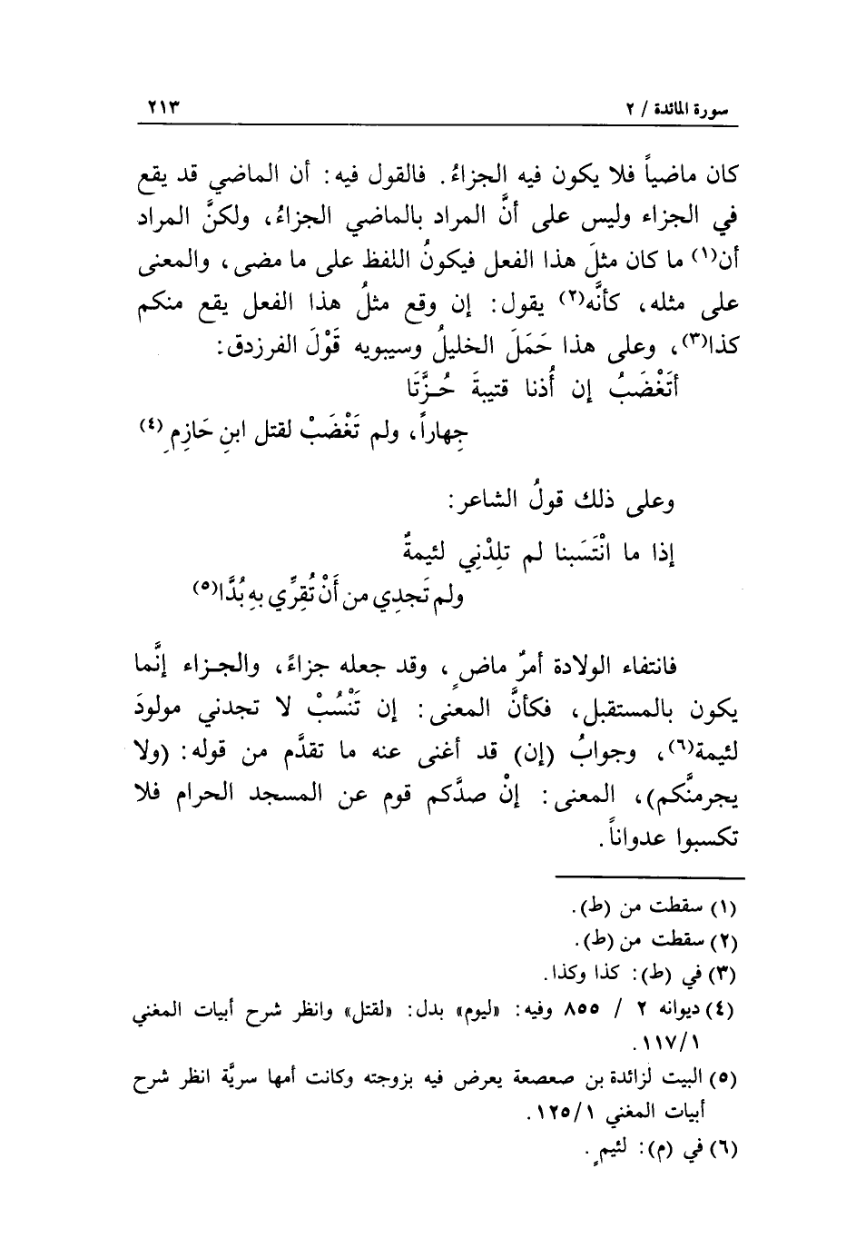«5» فانتفاء الولادة أمر ماض، وقد جعله جزاء، والجزاء إنّما يكون بالمستقبل، فكأنّ المعنى: إن تنسب لا تجدني مولود لئيمة «6»، وجواب إن قد أغنى عنه ما تقدّم من قوله: ولا يجرمنكم، المعنى: إن صدّكم قوم عن المسجد الحرام فلا تكسبوا عدوانا.