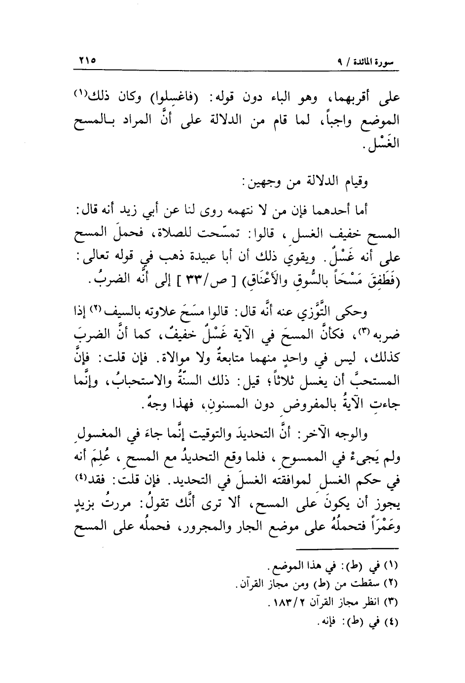 والوجه الآخر: أنّ التحديد والتوقيت إنّما جاء في المغسول ولم يجيء في الممسوح، فلما وقع التحديد مع المسح، علم أنّه في حكم الغسل لموافقته الغسل في التحديد. فإن قلت: فقد «4» يجوز أن يكون على المسح، ألا ترى أنّك تقول: مررت بزيد وعمرا فتحمله على موضع الجار والمجرور، فحمله على المسح