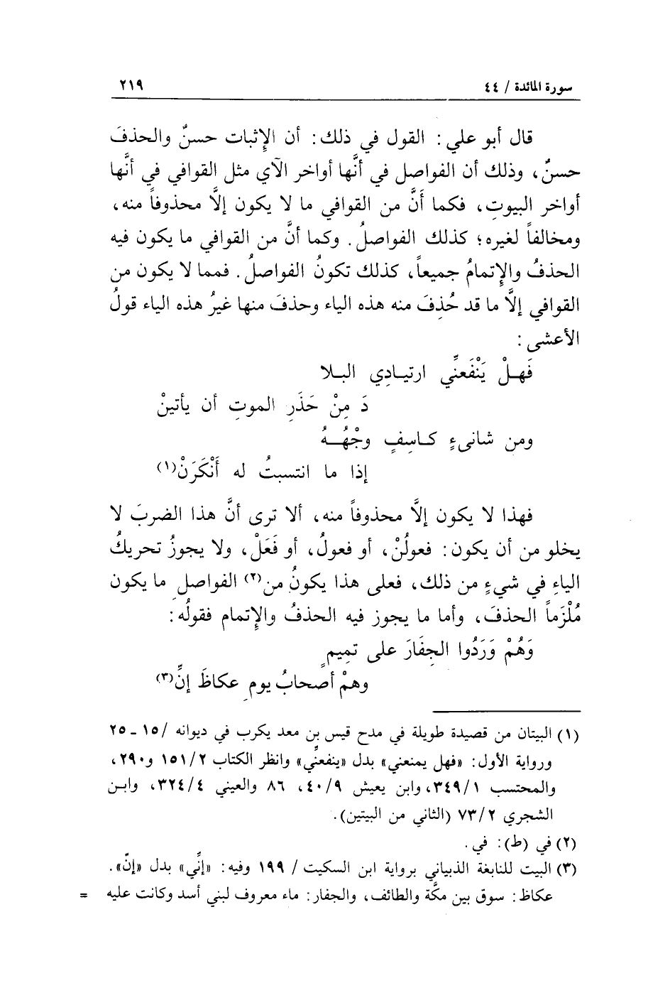 قال أبو علي: القول في ذلك: أن الإثبات حسن والحذف حسن، وذلك أن الفواصل في أنّها أواخر الآي مثل القوافي في أنّها أواخر البيوت، فكما أنّ من القوافي ما لا يكون إلّا