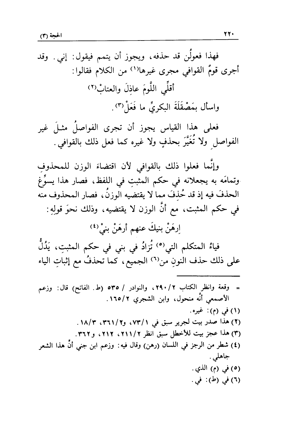 وإنّما فعلوا ذلك بالقوافي لأن اقتضاء الوزن للمحذوف وتمامه به يجعلانه في حكم المثبت في اللفظ، فصار هذا يسوّغ الحذف فيه إذ قد حذف مما لا يقتضيه الوزن، فصار المحذوف منه في حكم المثبت، مع أنّ الوزن لا يقتضيه، وذلك نحو قوله: