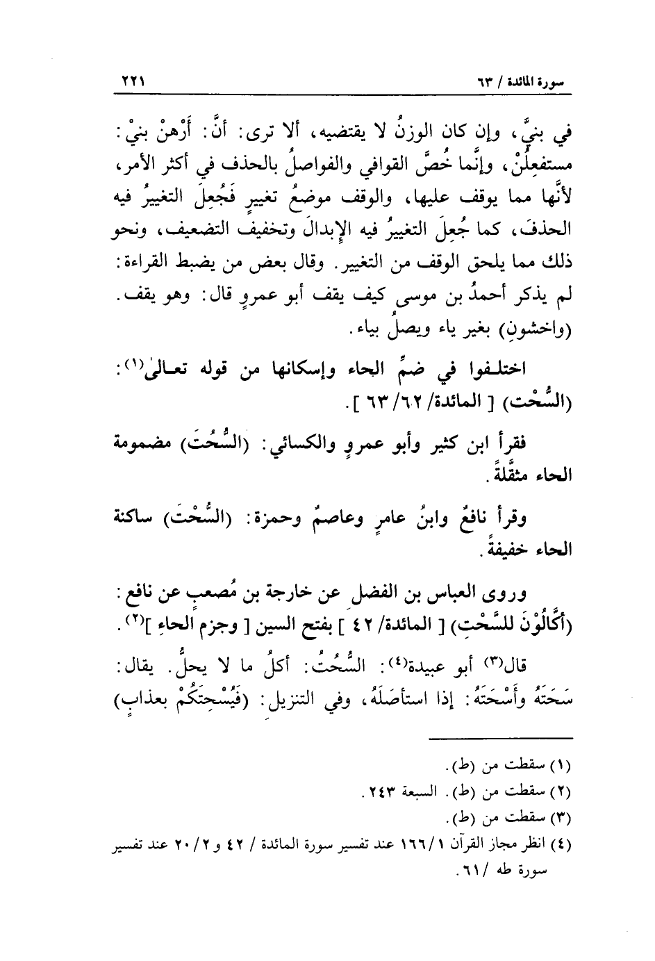 (4) انظر مجاز القرآن 1/ 166 عند تفسير سورة المائدة/ 42 و 2/ 20 عند تفسير سورة طه/ 61.