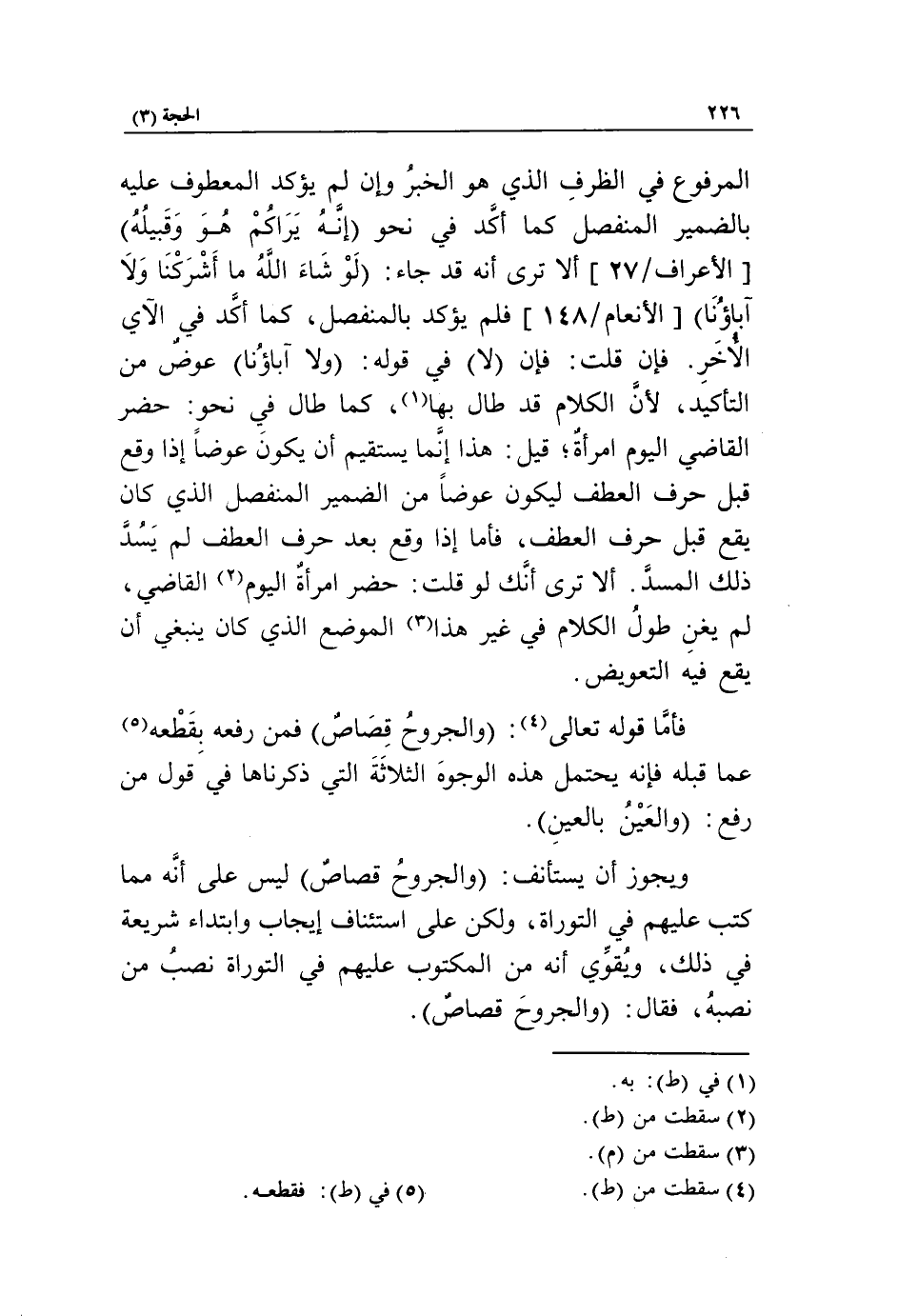 فأمّا قوله تعالى «4»: والجروح قصاص فمن رفعه بقطعه «5» عما قبله فإنه يحتمل هذه الوجوه الثلاثة التي ذكرناها في قول من رفع: والعين بالعين.