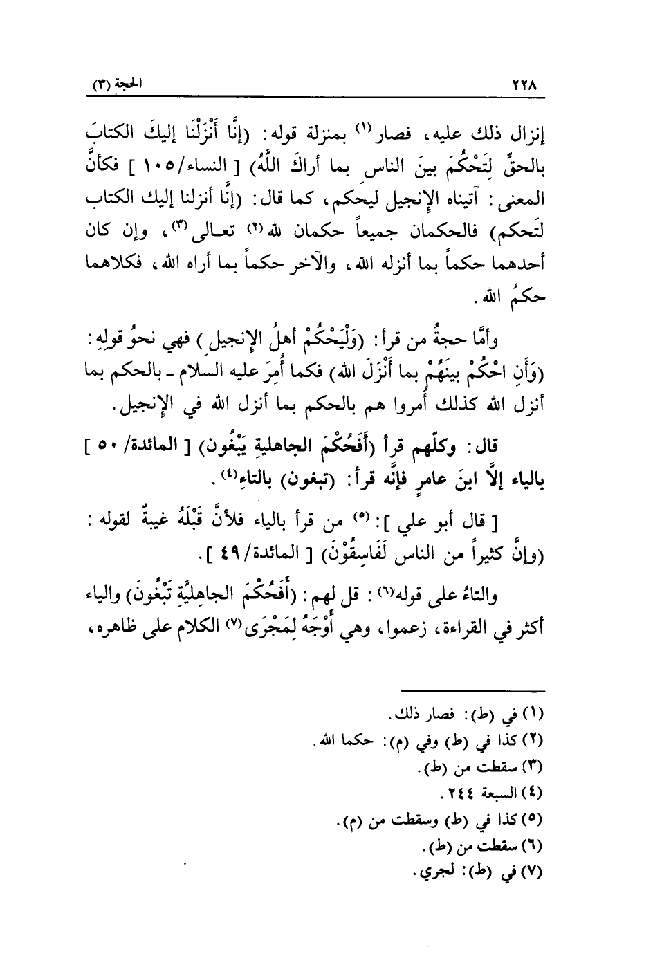 قال: وكلّهم قرأ أفحكم الجاهلية يبغون [المائدة/ 50] بالياء إلّا ابن عامر فإنّه قرأ: تبغون بالتاء «4».
