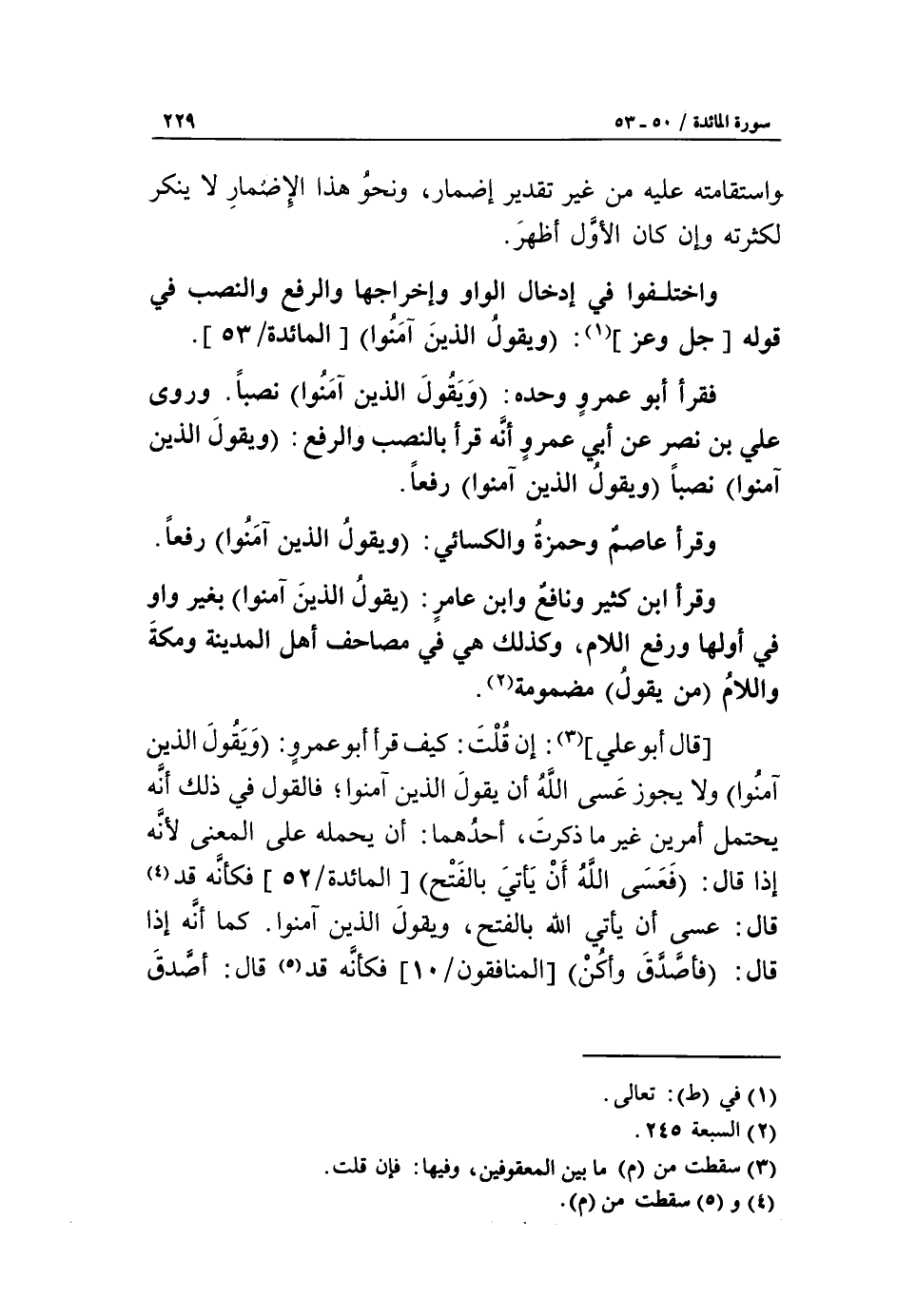 [قال أبو علي] «3»: إن قلت: كيف قرأ أبو عمرو: ويقول الذين آمنوا* ولا يجوز عسى الله أن يقول الذين آمنوا. فالقول في ذلك أنّه يحتمل أمرين غير ما ذكرت، أحدهما: أن يحمله على المعنى لأنّه إذا قال: فعسى الله أن يأتي بالفتح [المائدة/ 52] فكأنّه قد «4» قال: عسى أن يأتي الله بالفتح، ويقول الذين آمنوا. كما أنّه إذا قال: فأصدق وأكن [المنافقون/ 10] فكأنّه قد «4» قال: أصّدق