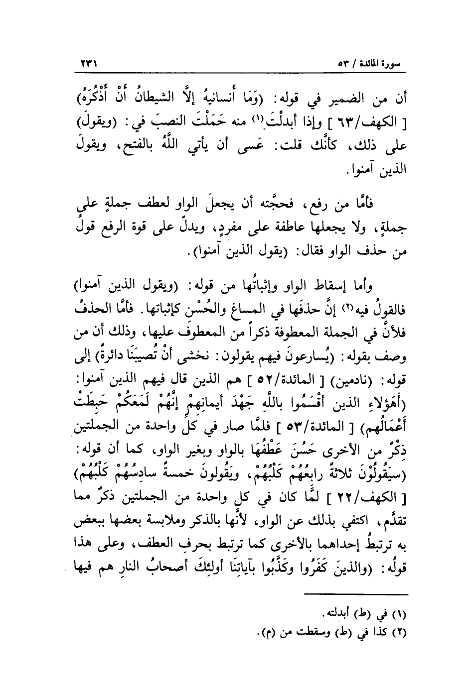 وأما إسقاط الواو وإثباتها من قوله: ويقول الذين آمنوا فالقول فيه «2» إنّ حذفها في المساغ والحسن كإثباتها. فأمّا الحذف فلأنّ في الجملة المعطوفة ذكرا من المعطوف عليها، وذلك أن من وصف بقوله: يسارعون فيهم يقولون: نخشى أن تصيبنا دائرة إلى قوله: نادمين [المائدة/ 52] هم الذين قال فيهم الذين آمنوا: