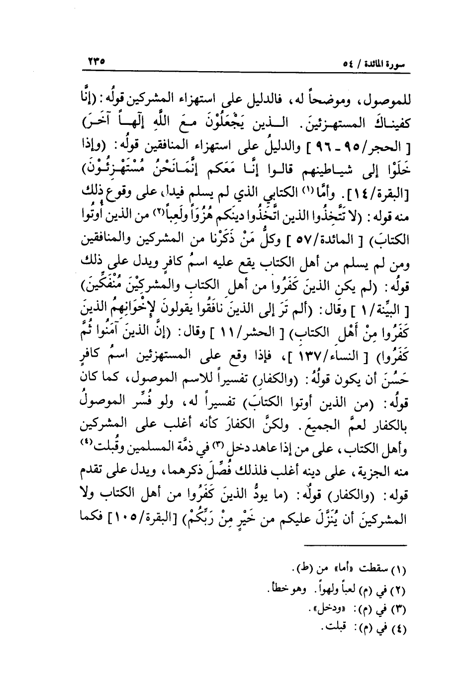 للموصول، وموضحا له، فالدليل على استهزاء المشركين قوله: إنا كفيناك المستهزئين. الذين يجعلون مع الله إلها آخر [الحجر/ 95 - 96] والدليل على استهزاء المنافقين قوله: وإذا خلوا إلى شياطينهم قالوا إنا معكم إنما نحن مستهزؤن [البقرة/ 14]. وأمّا «1» الكتابي الذي لم يسلم فيدا، على وقوع ذلك منه قوله: لا تتخذوا الذين اتخذوا دينكم هزوا ولعبا «2» من الذين أوتوا الكتاب [المائدة/ 57] وكلّ من ذكرنا من المشركين والمنافقين ومن لم يسلم من أهل الكتاب يقع عليه اسم كافر ويدل على ذلك قوله: لم يكن الذين كفروا من أهل الكتاب والمشركين منفكين [البيّنة/ 1] وقال: ألم تر إلى الذين نافقوا يقولون لإخوانهم الذين كفروا من أهل الكتاب [الحشر/ 11] وقال: إن الذين آمنوا ثم كفروا [النساء/ 137]، فإذا وقع على المستهزئين اسم كافر حسن أن يكون قوله: والكفار* تفسيرا للاسم الموصول، كما كان قوله: من الذين أوتوا الكتاب تفسيرا له، ولو فسّر الموصول بالكفار لعمّ الجميع. ولكنّ الكفار كأنه أغلب على المشركين وأهل الكتاب، على من إذا عاهد دخل «3» في ذمّة المسلمين وقبلت «4» منه الجزية، على دينه أغلب فلذلك فصّل ذكرهما، ويدل على تقدم قوله: والكفار* قوله: ما يود الذين كفروا من أهل الكتاب ولا المشركين أن ينزل عليكم من خير من ربكم [البقرة/ 105] فكما