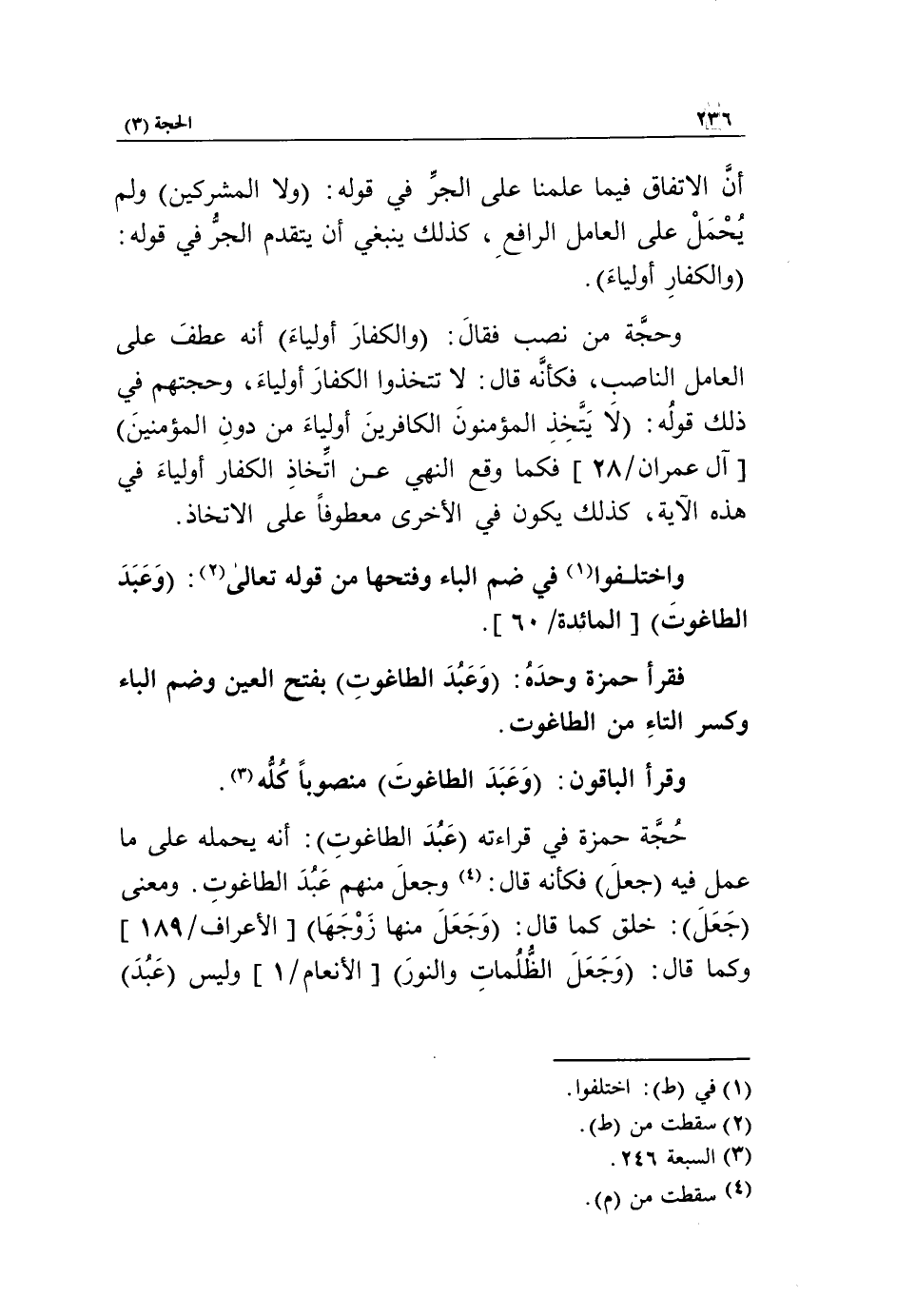 حجّة حمزة في قراءته عبد الطاغوت: أنه يحمله على ما عمل فيه جعل* فكأنه قال: «4» وجعل منهم عبد الطاغوت. ومعنى جعل*: خلق كما قال: وجعل منها زوجها [الأعراف/ 189] وكما قال: وجعل الظلمات والنور [الأنعام/ 1] وليس عبد*