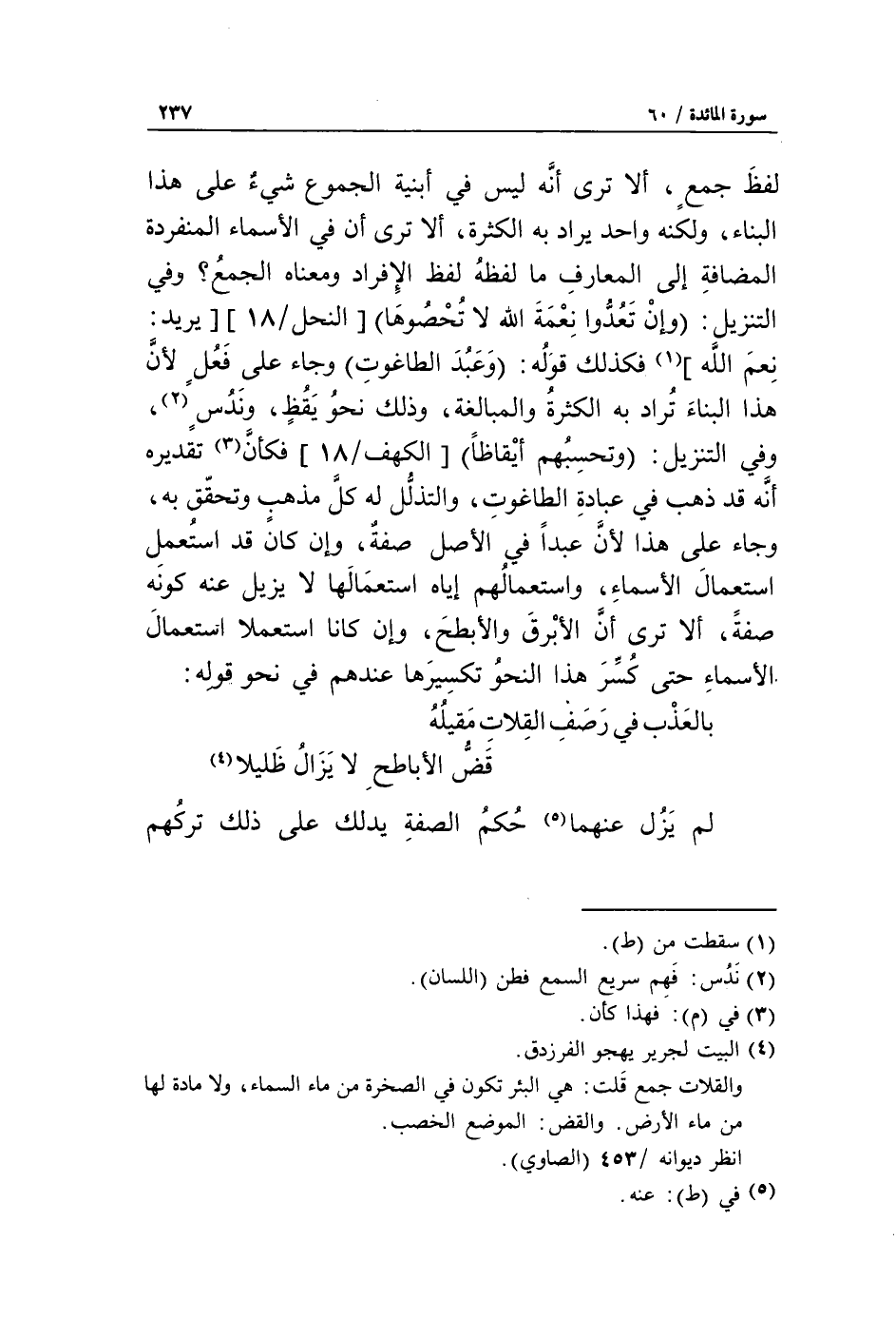 لفظ جمع، ألا ترى أنّه ليس في أبنية الجموع شيء على هذا البناء، ولكنه واحد يراد به الكثرة، ألا ترى أن في الأسماء المنفردة المضافة إلى المعارف ما لفظه لفظ الإفراد ومعناه الجمع؟ وفي التنزيل: وإن تعدوا نعمة الله لا تحصوها [النحل/ 18] [يريد: