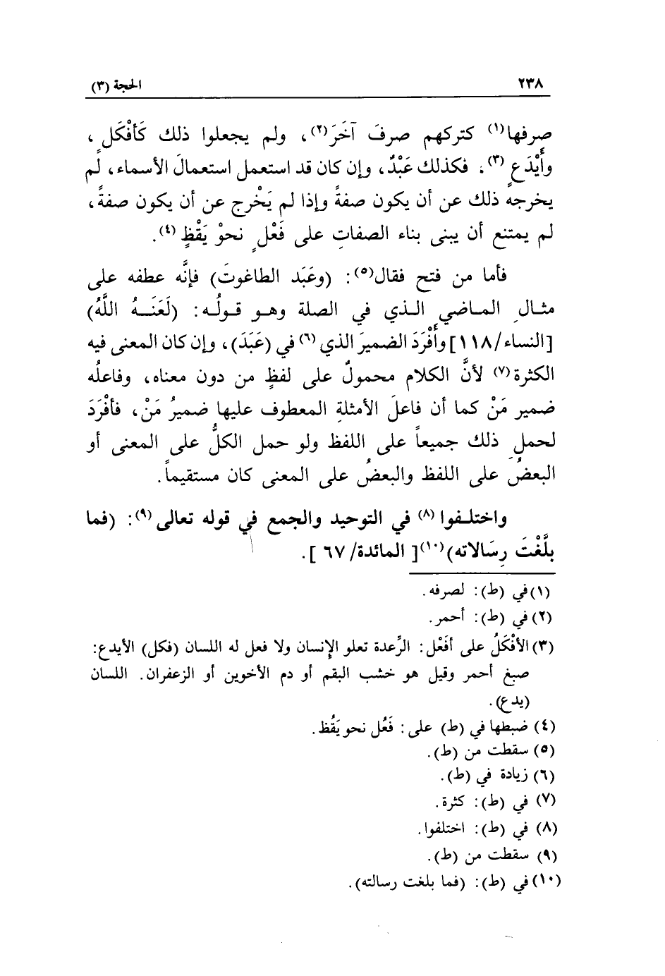 فأما من فتح فقال «5»: وعبد الطاغوت فإنّه عطفه على مثال الماضي الذي في الصلة وهو قوله: لعنه الله [النساء/ 118] وأفرد الضمير الذي «6» في عبد، وإن كان المعنى فيه الكثرة «7» لأنّ الكلام محمول على لفظ من دون معناه، وفاعله ضمير من كما أن فاعل الأمثلة المعطوف عليها ضمير من، فأفرد لحمل ذلك جميعا على اللفظ ولو حمل الكلّ على المعنى أو البعض على اللفظ والبعض على المعنى كان مستقيما.