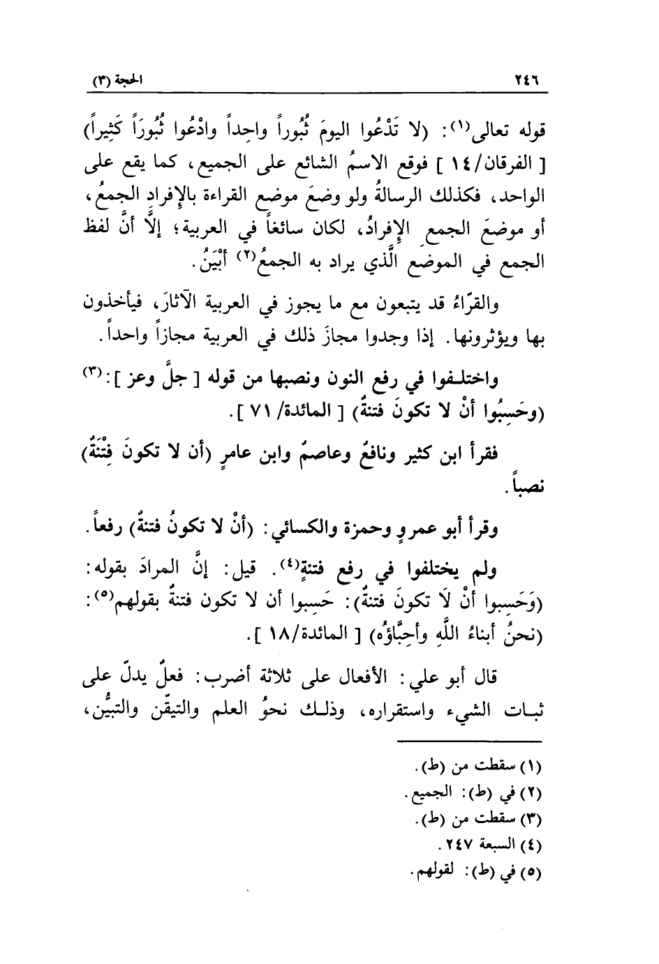 قوله تعالى «1»: لا تدعوا اليوم ثبورا واحدا وادعوا ثبورا كثيرا [الفرقان/ 14] فوقع الاسم الشائع على الجميع، كما يقع على الواحد، فكذلك الرسالة ولو وضع موضع القراءة بالإفراد الجمع، أو موضع الجمع الإفراد، لكان سائغا في العربية، إلّا أنّ لفظ الجمع في الموضع الّذي يراد به الجمع «2» أبين.