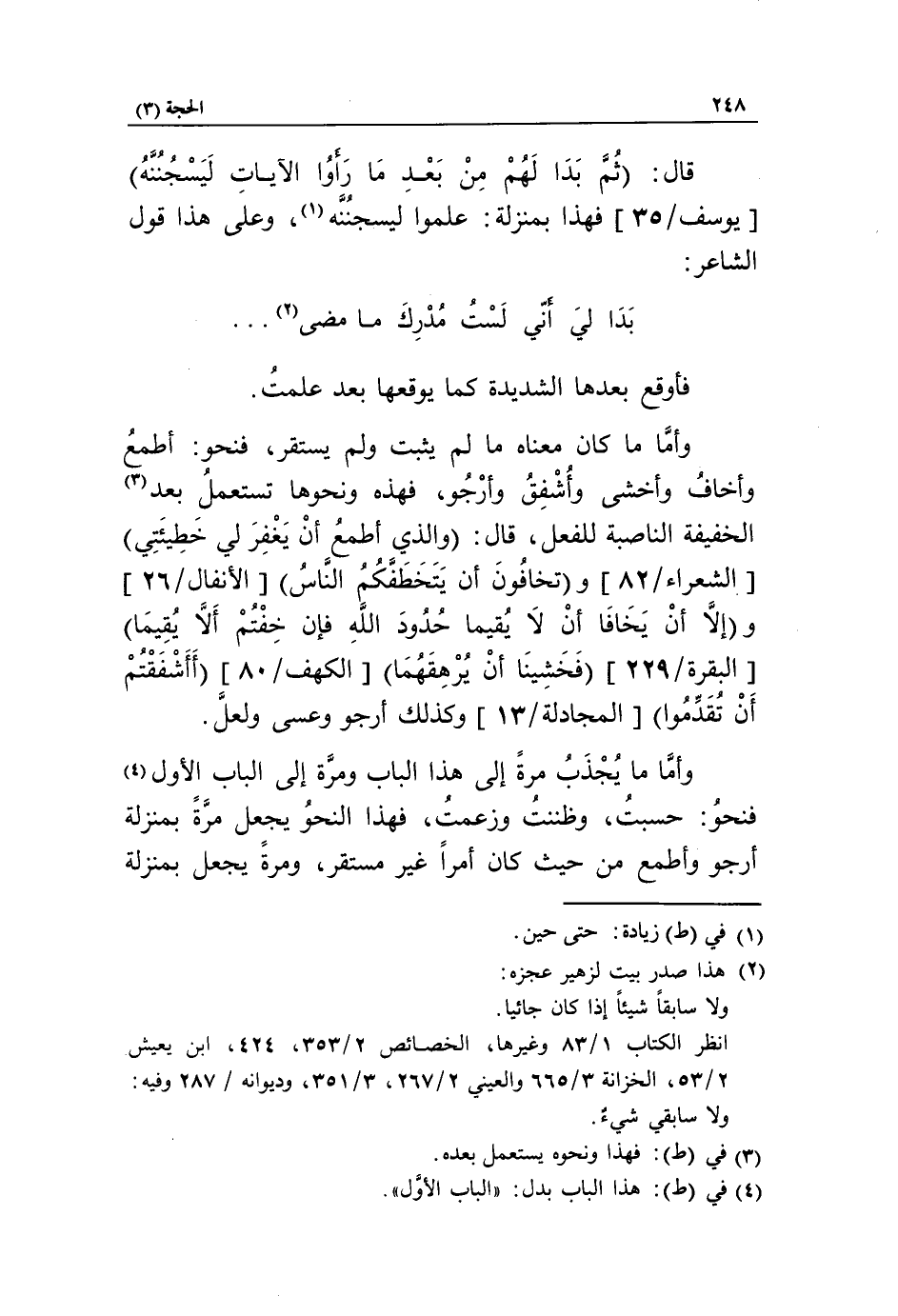 وأمّا ما كان معناه ما لم يثبت ولم يستقر، فنحو: أطمع وأخاف وأخشى وأشفق وأرجو، فهذه ونحوها تستعمل بعد «3» الخفيفة الناصبة للفعل، قال: والذي أطمع أن يغفر لي خطيئتي [الشعراء/ 82] وتخافون أن يتخطفكم الناس [الأنفال/ 26] وإلا أن يخافا ألا يقيما حدود الله فإن خفتم ألا يقيما [البقرة/ 229] فخشينا أن يرهقهما [الكهف/ 80] أأشفقتم أن تقدموا [المجادلة/ 13] وكذلك أرجو وعسى ولعلّ.