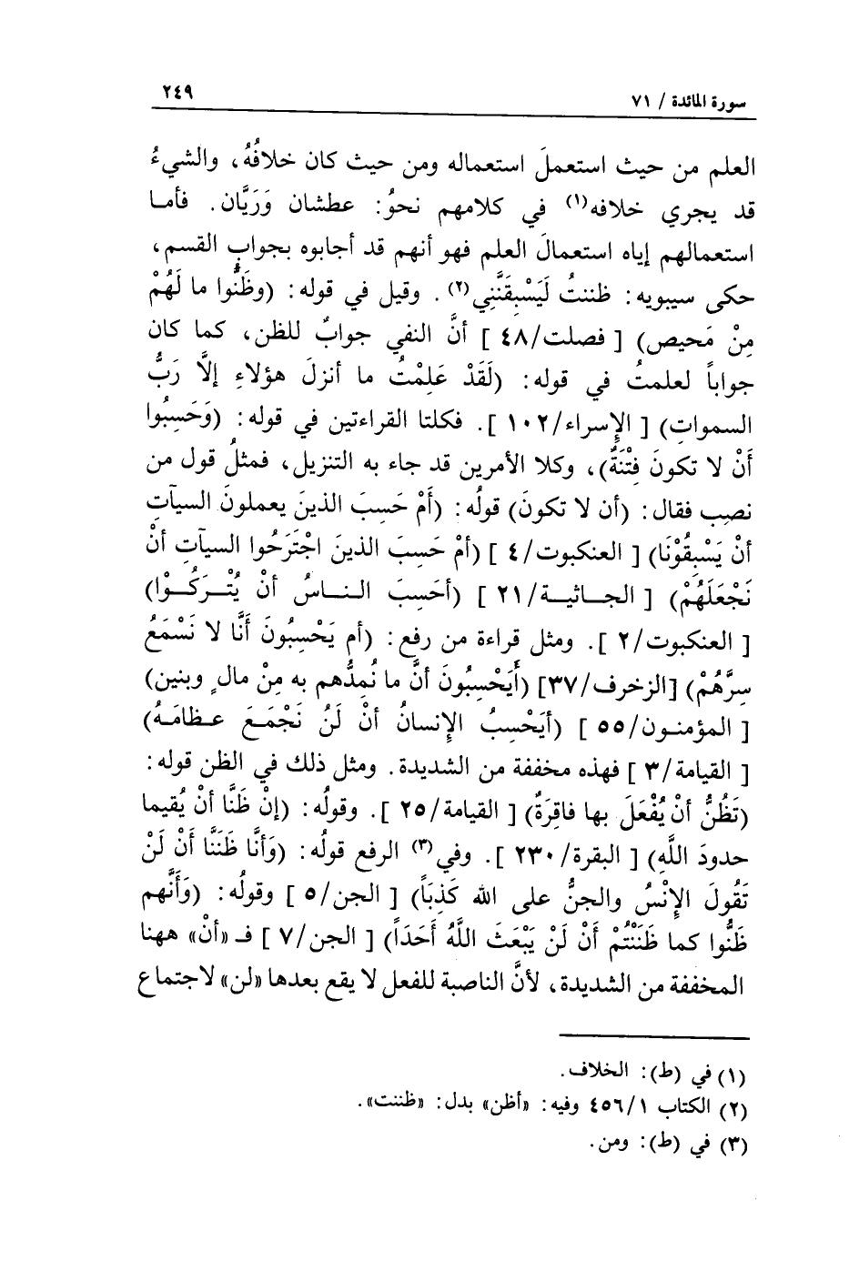 العلم من حيث استعمل استعماله ومن حيث كان خلافه، والشيء قد يجري خلافه «1» في كلامهم نحو: عطشان وريّان. فأما استعمالهم إياه استعمال العلم فهو أنهم قد أجابوه بجواب القسم، حكى سيبويه: ظننت ليسبقنّني «2». وقيل في قوله: وظنوا ما لهم من محيص [فصلت/ 48] أنّ النفي جواب للظن، كما كان جوابا لعلمت في قوله: لقد علمت ما أنزل هؤلاء إلا رب السماوات [الإسراء/ 102]. فكلتا القراءتين في قوله: وحسبوا ألا تكون فتنة، وكلا الأمرين قد جاء به التنزيل، فمثل قول من نصب فقال: ألا تكون قوله: أم حسب الذين يعملون السيئات أن يسبقونا [العنكبوت/ 4] أم حسب الذين اجترحوا السيئات أن نجعلهم [الجاثية/ 21] أحسب الناس أن يتركوا [العنكبوت/ 2]. ومثل قراءة من رفع: أم يحسبون أنا لا نسمع سرهم [الزخرف/ 37] أيحسبون أنما نمدهم به من مال وبنين [المؤمنون/ 55] أيحسب الإنسان ألن نجمع عظامه [القيامة/ 3] فهذه مخففة من الشديدة. ومثل ذلك في الظن قوله: