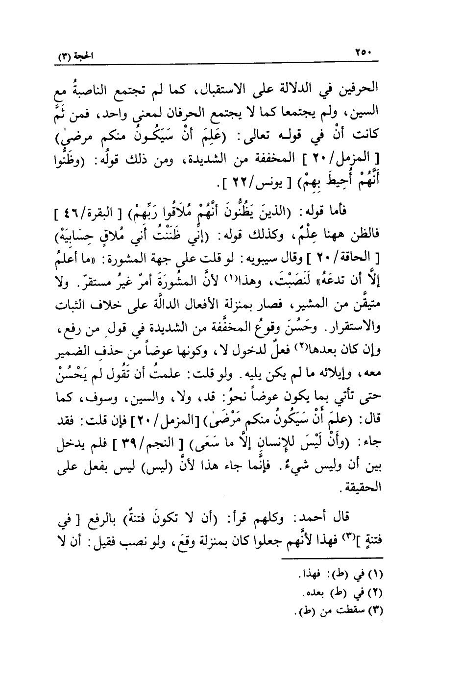 الحرفين في الدلالة على الاستقبال، كما لم تجتمع الناصبة مع السين، ولم يجتمعا كما لا يجتمع الحرفان لمعنى واحد، فمن ثمّ كانت أن في قوله تعالى: علم أن سيكون منكم مرضى [المزمل/ 20] المخففة من الشديدة، ومن ذلك قوله: وظنوا أنهم أحيط بهم [يونس/ 22].