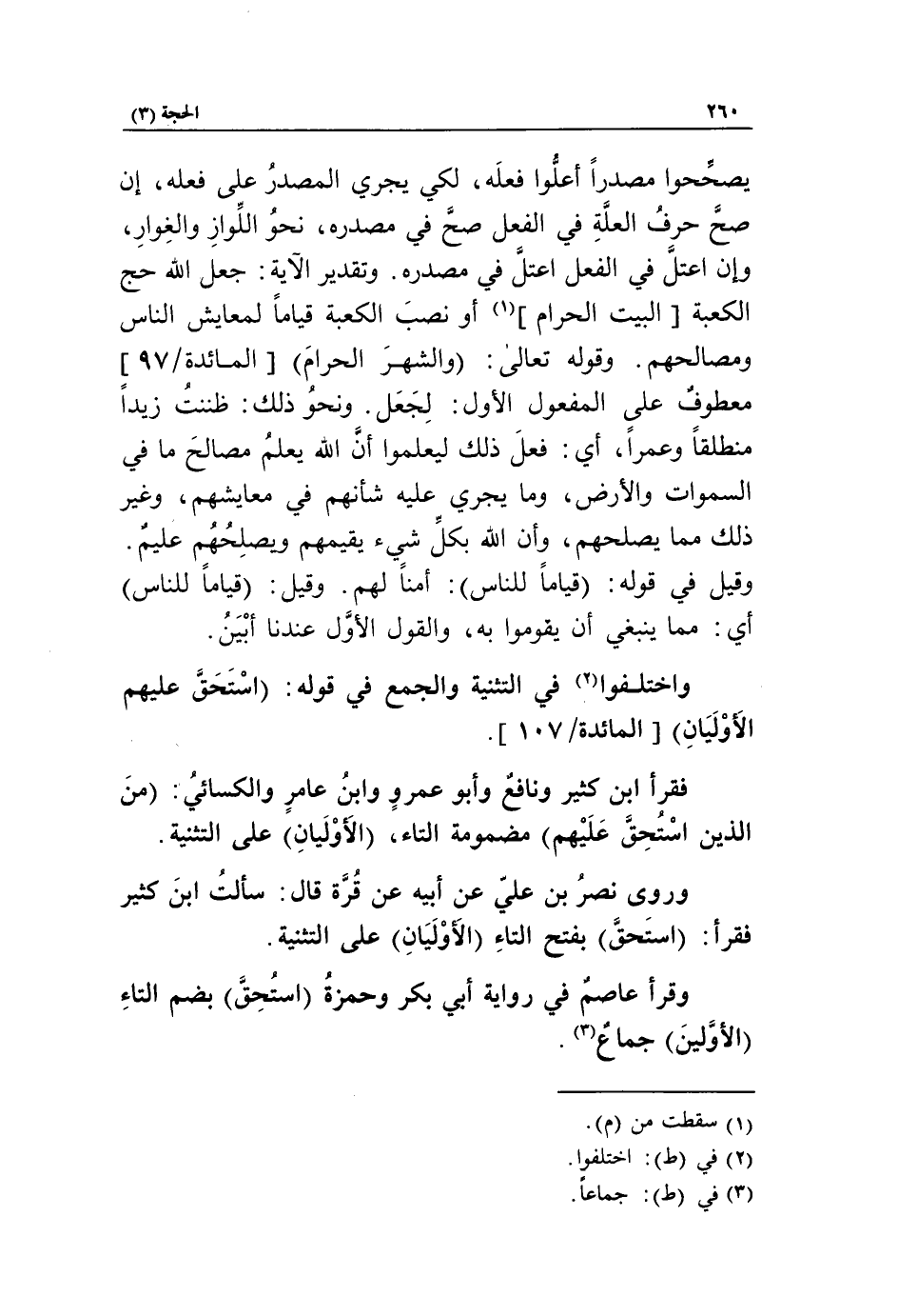 وقرأ عاصم في رواية أبي بكر وحمزة استحق بضم التاء الأولين* جماع «3».