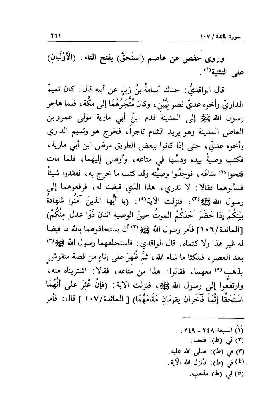قال الواقديّ: حدثنا أسامة بن زيد عن أبيه قال: كان تميم الداريّ وأخوه عديّ نصرانيّين، وكان متّجرهما إلى مكّة، فلما هاجر رسول الله صلى الله عليه وسلم إلى المدينة قدم ابن أبي مارية مولى عمرو بن العاص المدينة وهو يريد الشام تاجرا، فخرج هو وتميم الداري وأخوه عديّ، حتى إذا كانوا ببعض الطريق مرض ابن أبي مارية، فكتب وصية بيده ودسّها في متاعه، وأوصى إليهما، فلما مات فتحوا «2» متاعه، فوجدوا وصيّته وقد كتب ما خرج به، ففقدوا شيئا فسألوهما فقالا: لا ندري، هذا الذي قبضنا له، فرفعوهما إلى رسول الله صلى الله عليه وسلم «3» فنزلت الآية «4»: يا أيها الذين آمنوا شهادة بينكم إذا حضر أحدكم الموت حين الوصية اثنان ذوا عدل منكم [المائدة/ 106] فأمر رسول الله صلى الله عليه وسلم «3» أن يستحلفوهما بالله ما قبضا له غير هذا ولا كتماه. قال الواقدي: فاستحلفهما رسول الله صلى الله عليه وسلم «3» بعد العصر، فمكثا ما شاء الله، ثمّ ظهر على إناء من فضة منقوش بذهب «7» معهما، فقالوا: هذا من متاعه، فقالا: اشتريناه منه، وارتفعوا إلى رسول الله صلى الله عليه وسلم، فنزلت الآية: فإن عثر على أنهما استحقا إثما فآخران يقومان مقامهما [المائدة/ 107] قال: فأمر