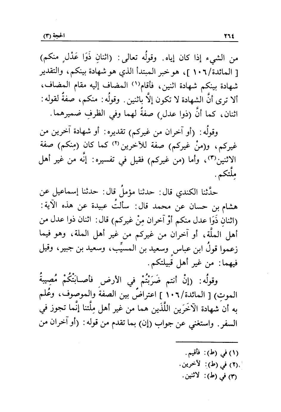 وقوله: أو آخران من غيركم تقديره: أو شهادة آخرين من غيركم، ومن غيركم صفة للآخرين «2» كما كان منكم صفة الاثنين «3»، وأما من غيركم فقيل في تفسيره: إنّه من غير أهل ملّتكم.