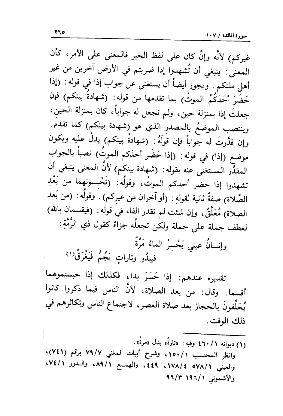 «1» تقديره عندهم: إذا حسر بدا، فكذلك إذا حبستموهما أقسما. وقال: من بعد الصلاة، لأنّ الناس فيما ذكروا كانوا يحلّفون بالحجاز بعد صلاة العصر، لاجتماع الناس وتكاثرهم في ذلك الوقت.
