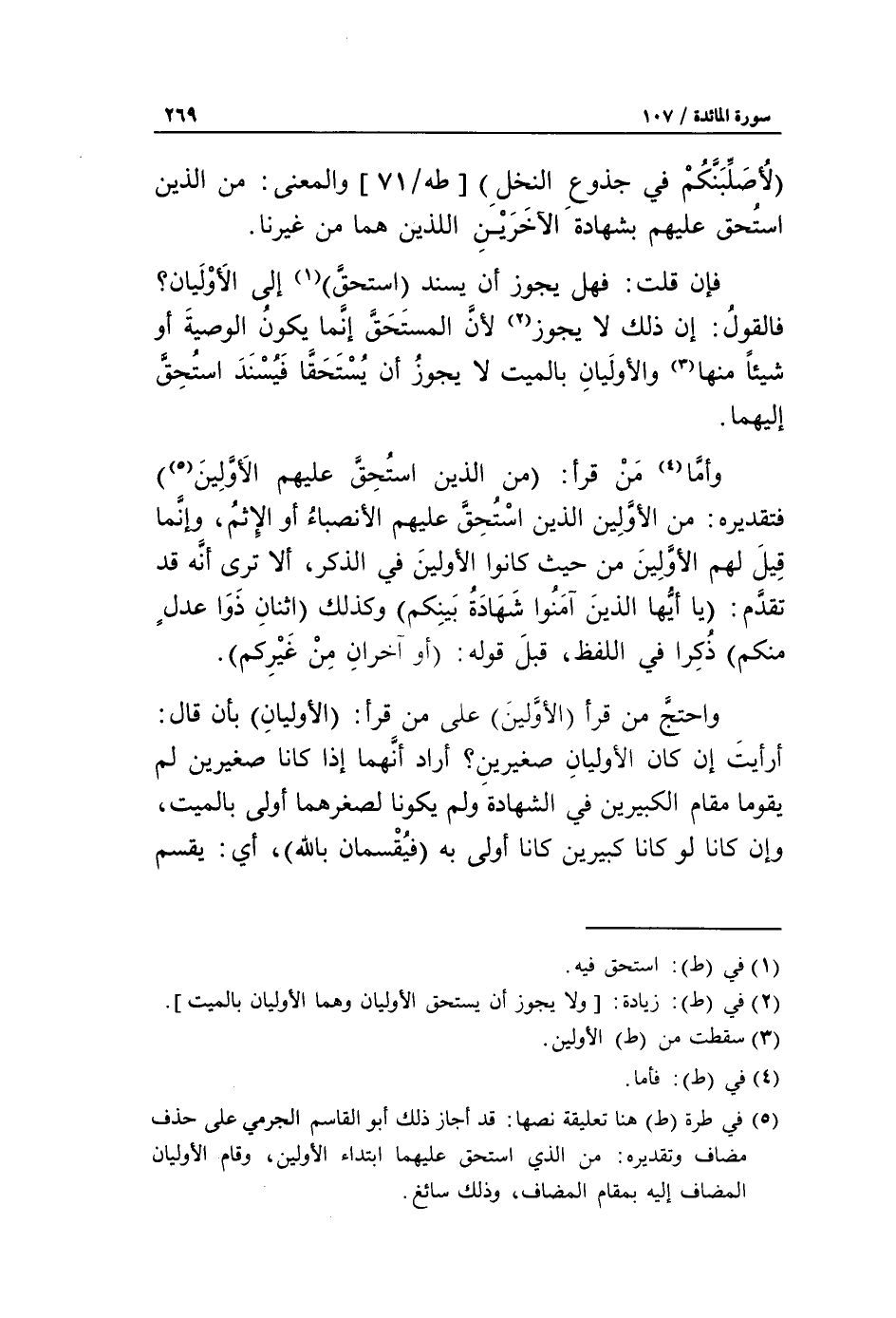 (5) في طرة (ط) هنا تعليقة نصها: قد أجاز ذلك أبو القاسم الجرمي على حذف مضاف وتقديره: من الذي استحق عليهما ابتداء الأولين، وقام الأوليان المضاف إليه بمقام المضاف، وذلك سائغ.
